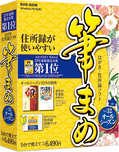 また、3月4日(金)からはパッケージ版の「筆まめVer.32 オールシーズン」、「同 アップグレード・乗換版」、「筆王Ver.26 オールシーズン」(価格はすべてダウンロード版と同額、税込)の3製品を弊社サイトおよび家電量販店で発売いたします。暑中見舞いなど四季折々のごあいさつのはがきはもちろん、来年の年賀状デザインにも使えます。