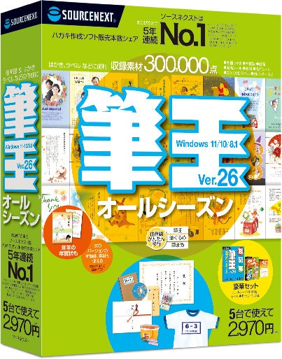 「筆王」は、かんたん、お得、高性能。コストパフォーマンスに優れたはがき作成ソフトで、5年連続販売本数シェア第1位(注2)のソースネクストの定番ソフトです。