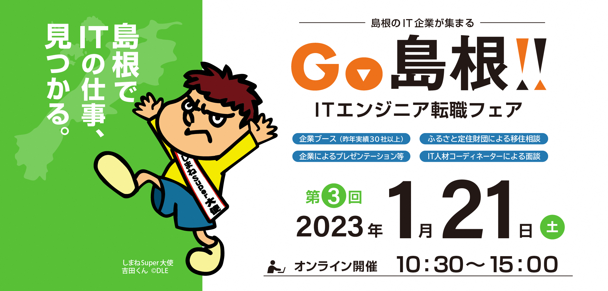 島根県が運営するITに特化した無料職業紹介制度「IT WORKS@島根」は、IT転職イベント「GO島根!ITエンジニア転職フェア」を令和5年1月21日(土)に開催します。