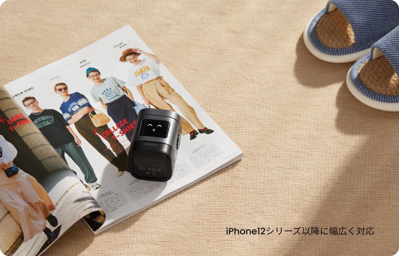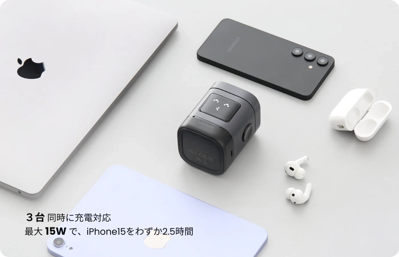 前面スクリーンに表示されるロボットの表情で充電状況がわかり、充電時をワクワク体験に変える近未来的ガジェットです。iPhone、AirPodsなどを3台同時に充電可能で、最大15W出力ができるQi2対応の充電器です。iPhoneをわずか約2.5時間でフル充電可能です(iPhone 15の場合)。