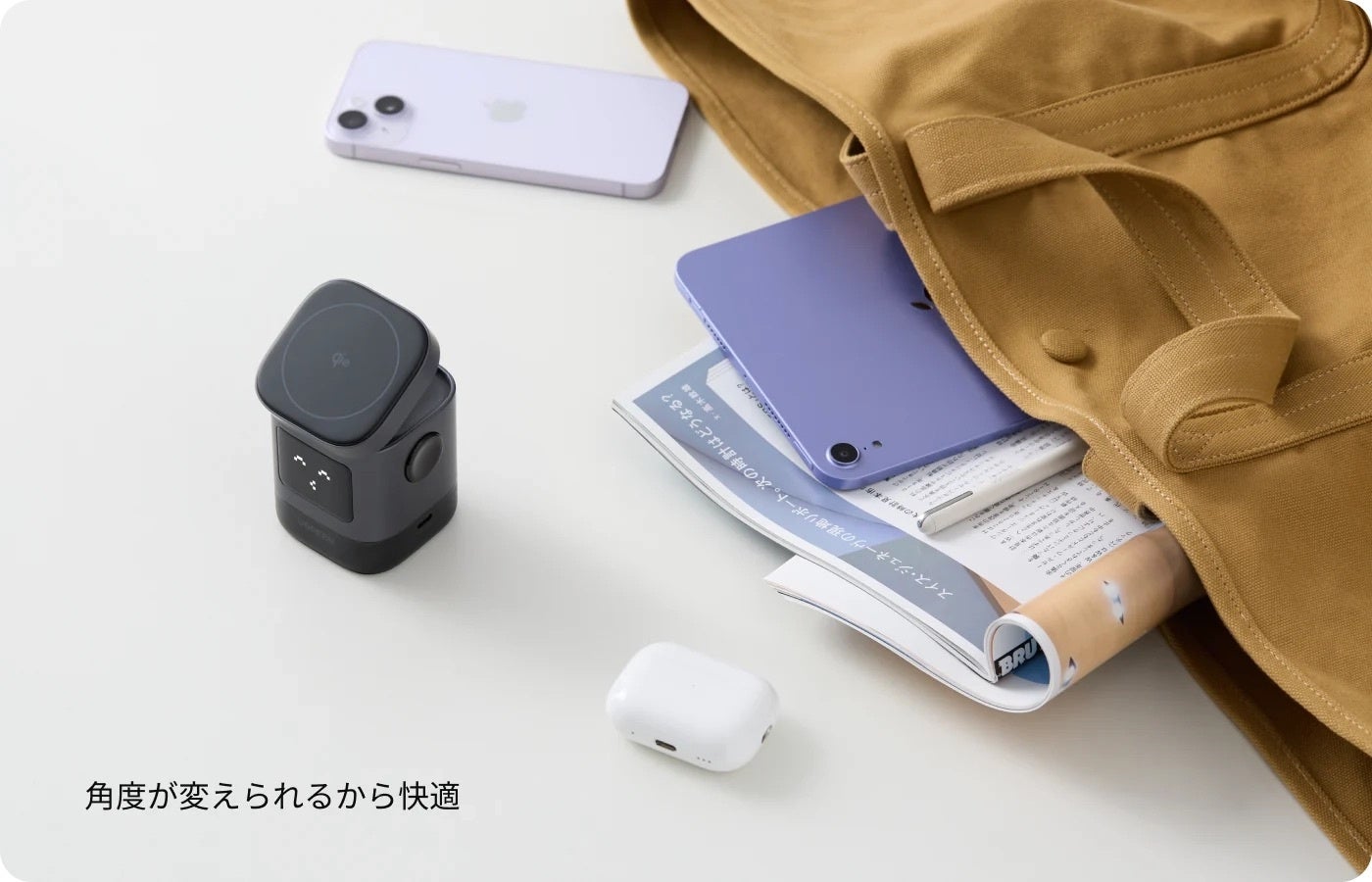 上部のワイヤレス充電ベースは、MagSafe対応のiPhoneを取り付けできるマグネット式となっています。マグネットの吸着力が強いので、iPhoneが滑り落ちる心配もありません。約70度までの角度調節が可能で、iPhoneを横向き縦向きのどちらでも設置ができます。ケーブル1本で接続ができ、本体を折りたたむことでコンパクトなサイズにでき、軽量設計にもなっています。