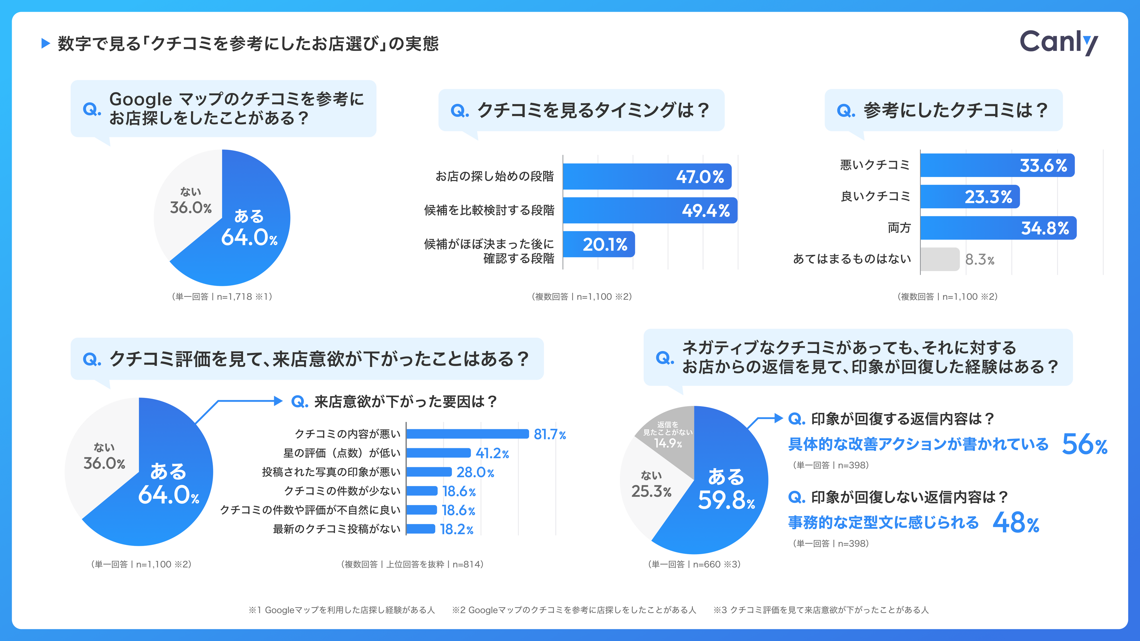 Google ビジネスプロフィール™︎・HP・各SNSの一括管理サービス「カンリー店舗集客」の開発・提供を行う株式会社カンリー(所在地:東京都品川区、代表取締役:辰巳 衛,秋山 祐太朗)は、店舗事業者向けに「お客様はクチコミをどこまで見ている?1000人の調査でわかった、お店選びに影響を与える内容とは?」を無料公開しましたので、ご案内いたします。