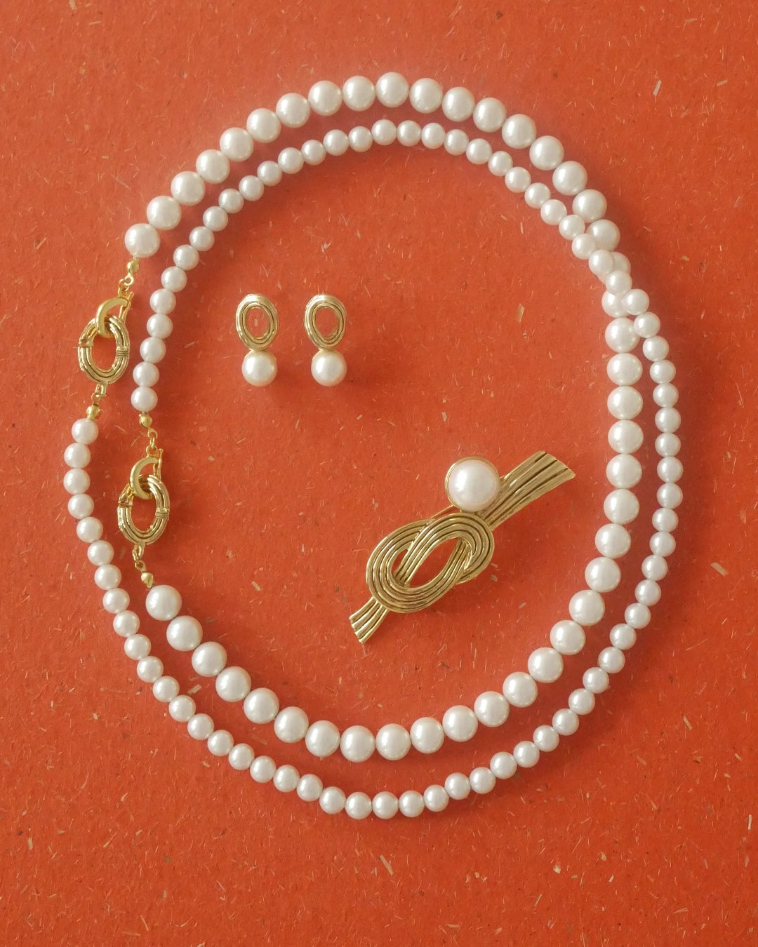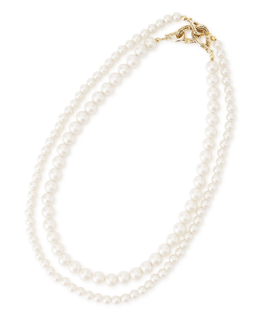 注目は、90cmのロングパールネックレス。50cmと40cmの2本に分けて使用でき、1本でもレイヤードしても楽しめます。カジュアルな装いに、クラシカルな雰囲気をプラスしてくれるアイテムです。