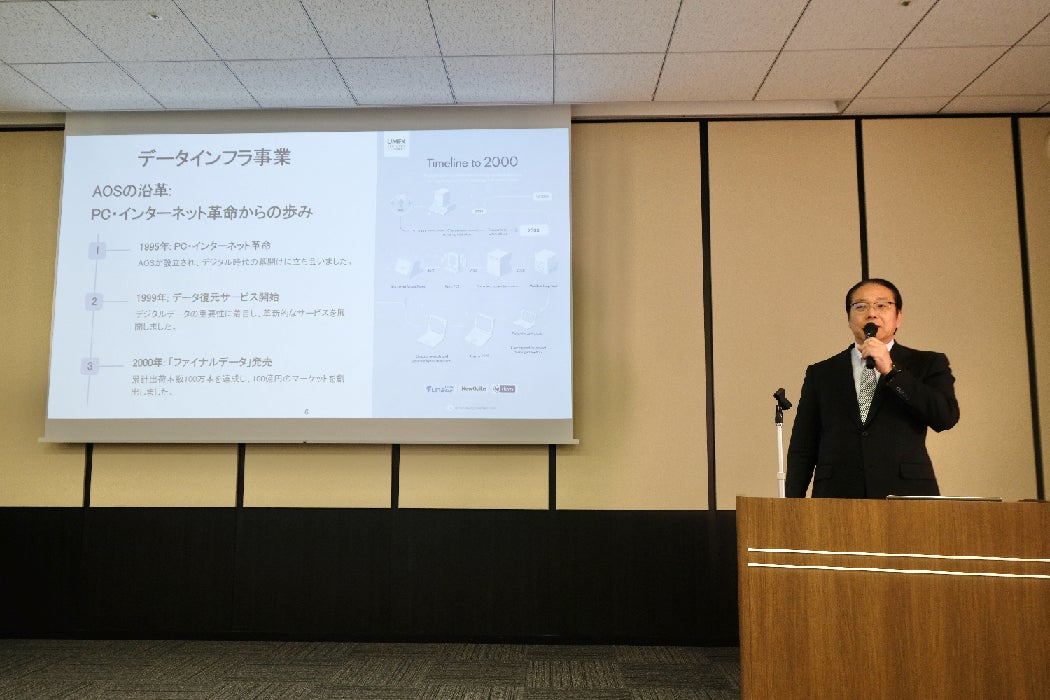 AOSデータ社は、データインフラと知財インフラを基盤に、20年以上にわたり企業や個人のデータ資産を守り、活用する事業を展開してきました。9,000社以上の企業、90万人以上のお客様から信頼を得ており、データ共有、バックアップ、復旧、移行、消去を包括する「データエコシステム事業」では、BCNアワードで15年連続販売本数1位を獲得しています。