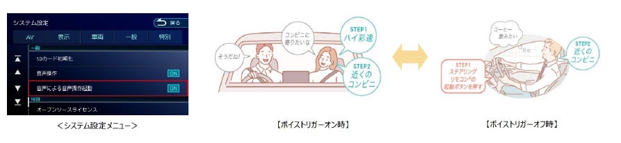 ハンドルから手を離さずに、発話してナビの操作ができる「音声操作」の起動を、音声で行うかボタン操作で行うかを設定※3できる「ボイストリガーのオン/オフ設定」を搭載。ボイストリガー(音声による音声操作起動)をオンにした場合、「ハイ彩速」と声をかけると音声操作が起動します。ボイストリガーをオフにした場合は、音声の影響を受けることなく、ステアリングリモコン※2などのボタン操作で音声操作を起動できます。