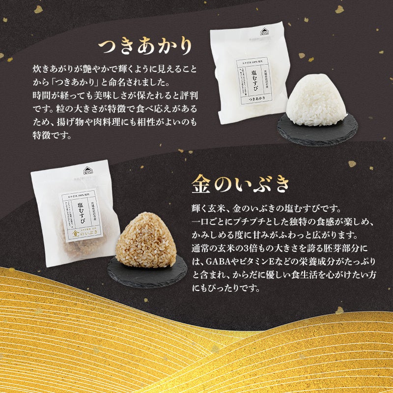 ②塩むすび5種12個入り(ひとめぼれ80g/個×3個、つや姫80g/個×3個、だて正夢80g/個×2個、つきあかり80g/個×2個、金のいぶき80g/個×2個):11,000円