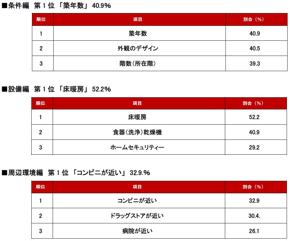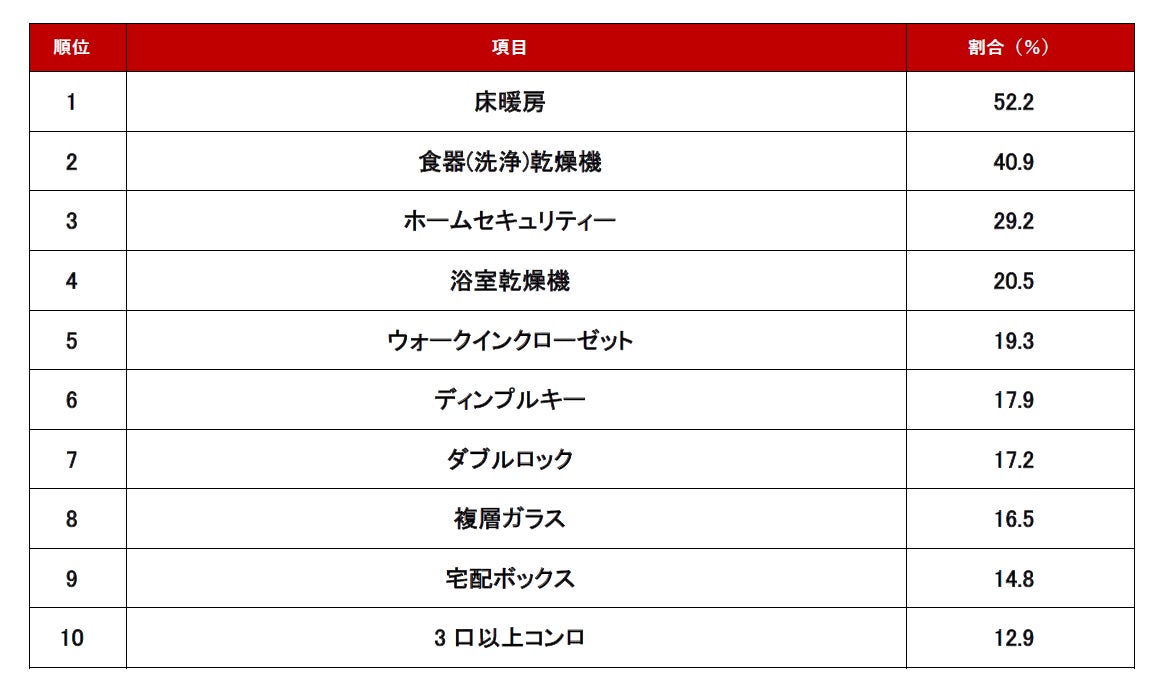 ファミリー世帯が妥協できる物件の設備を聞いたところ、「床暖房」が1位でした。不動産会社からは、「エアコンなどの代替手段がある」「後からリフォームで付けられるものは、購入時の条件に含めなくともいい」といったコメントが目立ちました。