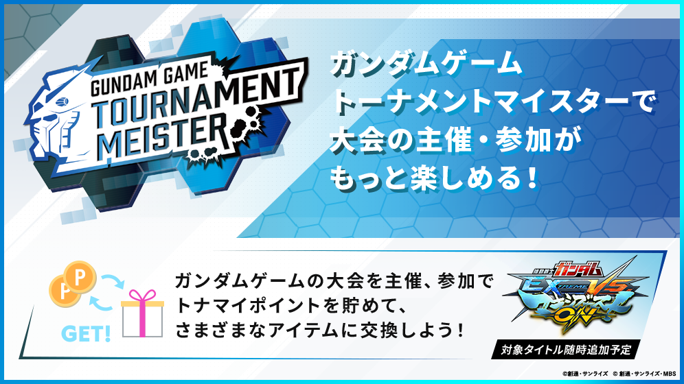 「ガンダムゲームトーナメントマイスター」は、株式会社カヤックが運営する大会主催・運営ツール「Tonamel」と連携することで、便利且つ快適にガンダムゲームの大会運営や大会への参加をすることができるとともに、本サービス内で使用できる「ガンダムゲームトーナメントマイスターポイント」(以下、トナマイポイント)を得て、さまざまなアイテムに交換することが可能です。