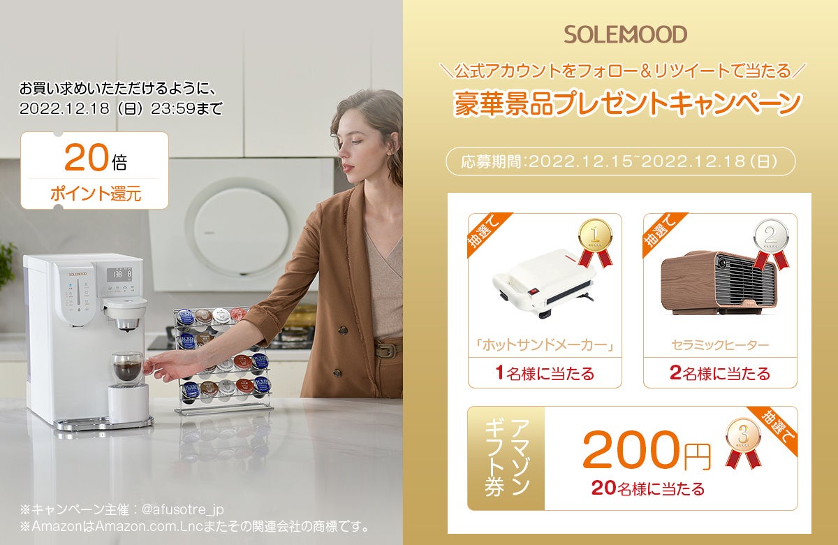 鑫三海株式会社は、楽天市場 公式店舗「SINSANKAI」での販売を記念して、2022年12月15日よりAFUストアのTwitter公式アカウントで、Amazonギフト券等豪華賞品が抽選で当たる「浄水型ウォーターサーバーPURE Twitterキャンペーン」を開催しました。