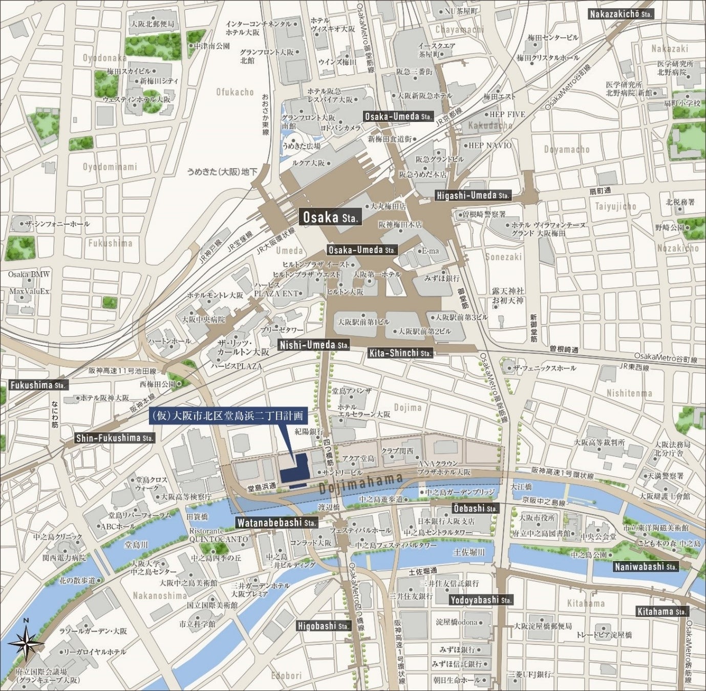 交通 | JR東海道本線「大阪」駅徒歩11分 Osaka Metro四つ橋線「西梅田」駅徒歩6分 Osaka Metro御堂筋線「淀屋橋」駅徒歩10分 JR東西線「北新地」駅徒歩6分 京阪電気鉄道中之島線「渡辺橋」駅徒歩3分 |