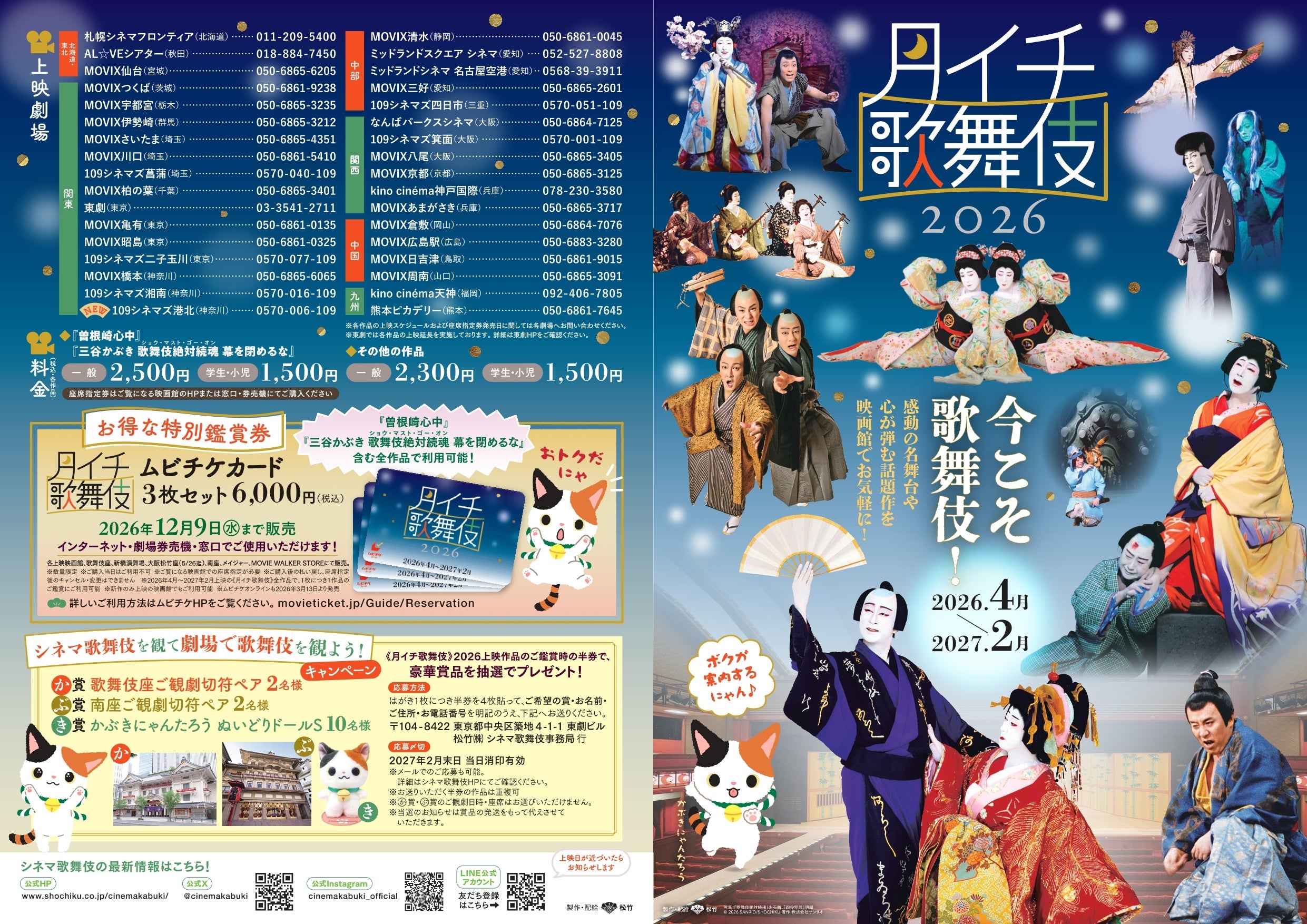 《月イチ歌舞伎》2026 のチラシ・ポスターの掲出と、新作にも利用できるお得な特別鑑賞券【ムビチケカード】3枚セット券の販売は上映映画館、歌舞伎座、新橋演舞場、大阪松竹座(5/26 迄)、南座ほかで実施中です。