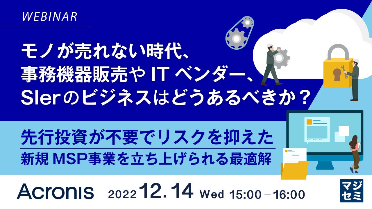 本セミナーでは、事務機器販売やITベンダー、SIerの方を対象に、「マネージドサービス事業」への参入を成功させるためのヒントを解説します。「案ずるより産むがやすし!」、アクロニスのサービス事業者向けプラットフォーム「Acronis Cyber Protect Cloud」を利用することで、簡単に先行投資不要、リスクフリー、月額¥30,000からのスモールスタートで新規MSP事業を開始することが可能です。既存ビジネスに対する危機感を持たれている方は、ぜひご参加ください。