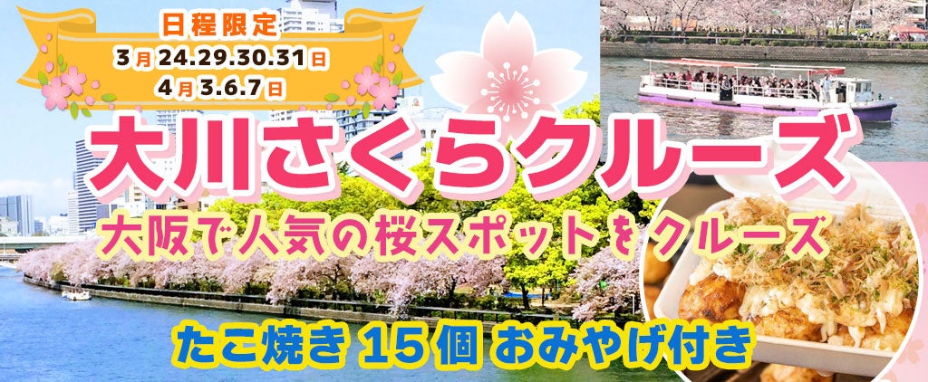 3月24日~4月7日限定!お一人様¥2,980- 春季限定水都大阪の定番お花見クルーズ 大川さくらクルーズ +たこ焼き60分食べ放題(ワンドリンク付)