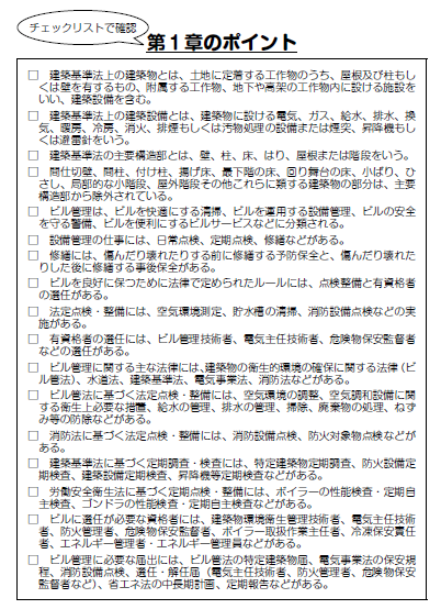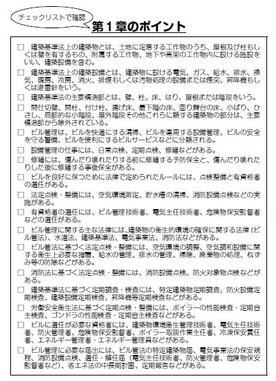 ◆章末に、法令の重要事項チェックリストを登載。どのような法令がビル管理に関わっているかがわかります!