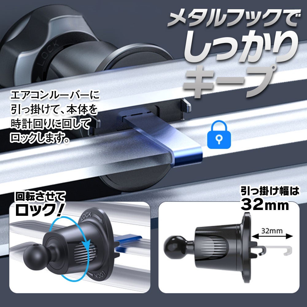 エアコンルーバー用スタンドのヘッド部はボールジョイント設計なので、360度回転可能。微調整も簡単です。