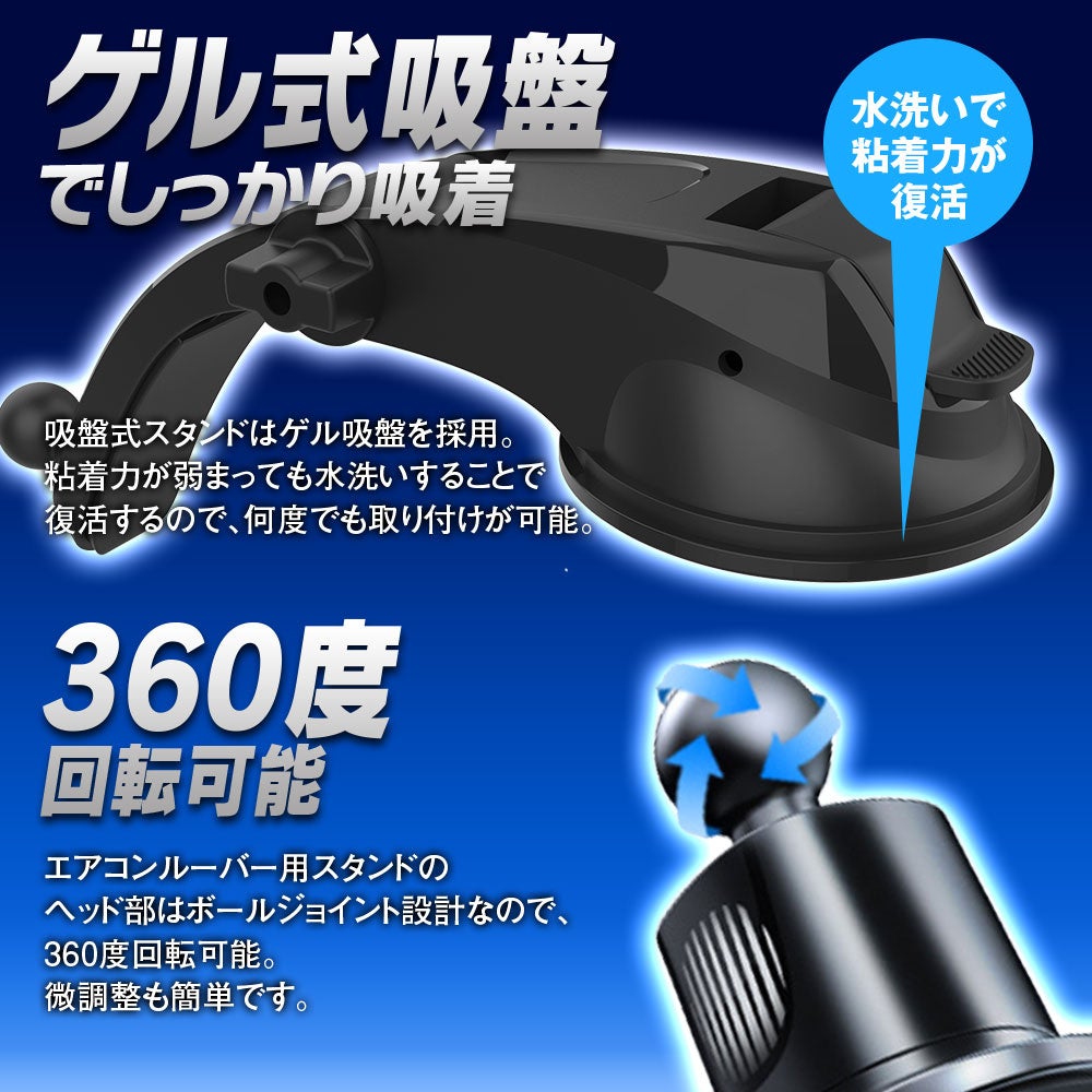 エアコンルーバー用と吸盤式の2つのスタンドを装備