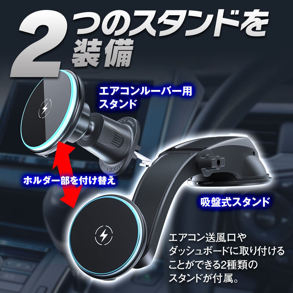 エアコンルーバー用と吸盤式の2つのスタンドが標準装備!スマートなLEDライト付き