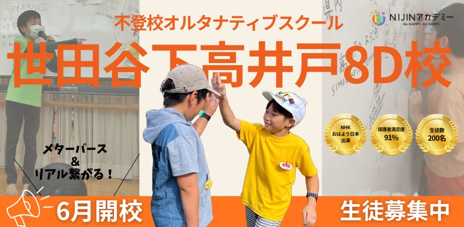 株式会社NIJIN(本社:東京都江東区、代表取締役:星野達郎)が運営する不登校オルタナティブスクール『NIJINアカデミー』はこの度、リアル教室“世田谷下高井戸8D校”を開校することをお知らせいたします。