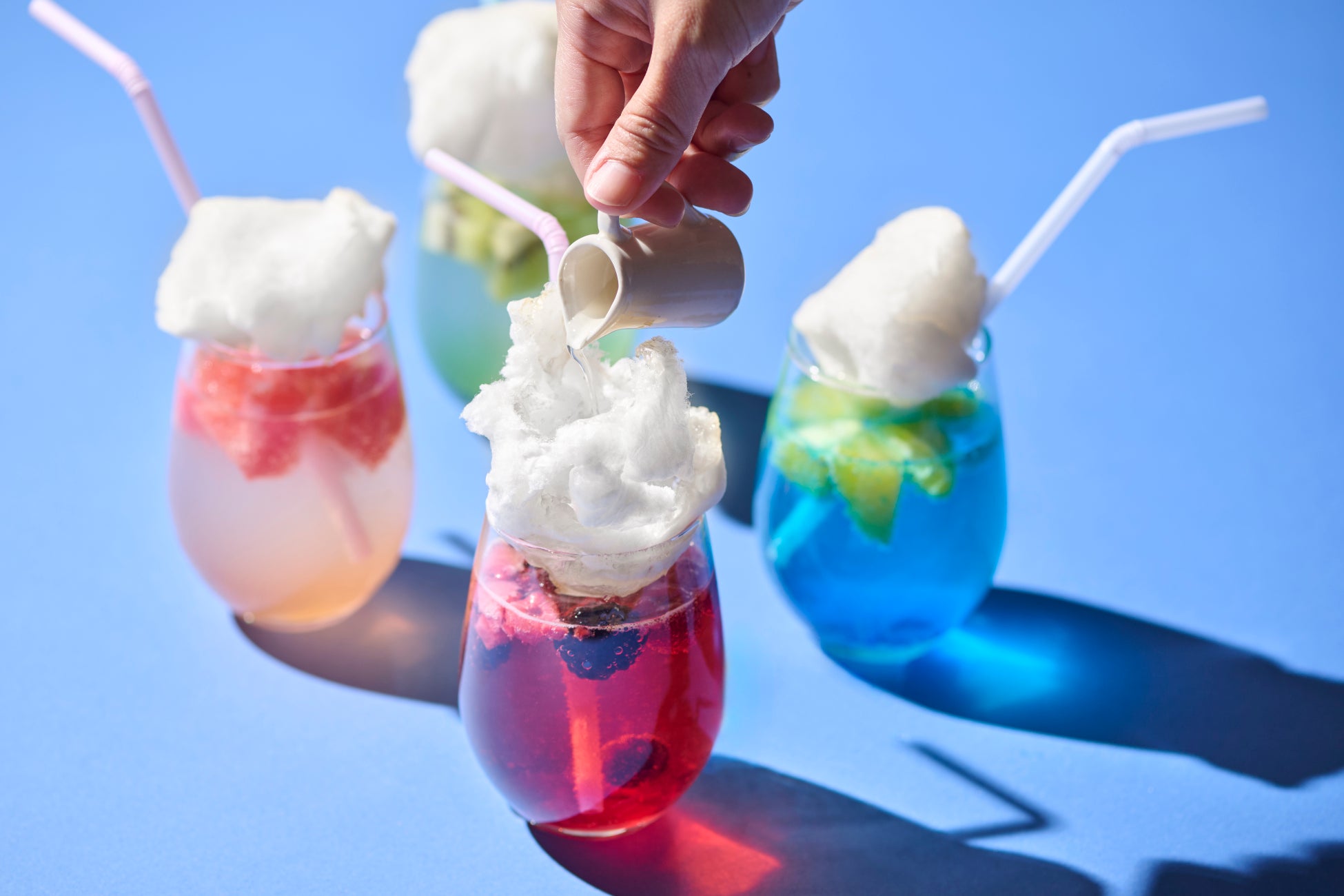 わたあめをソーダの上に乗せ、シロップをかけるとしゅーっとわたあめが消えていくのが楽しいドリンクです。