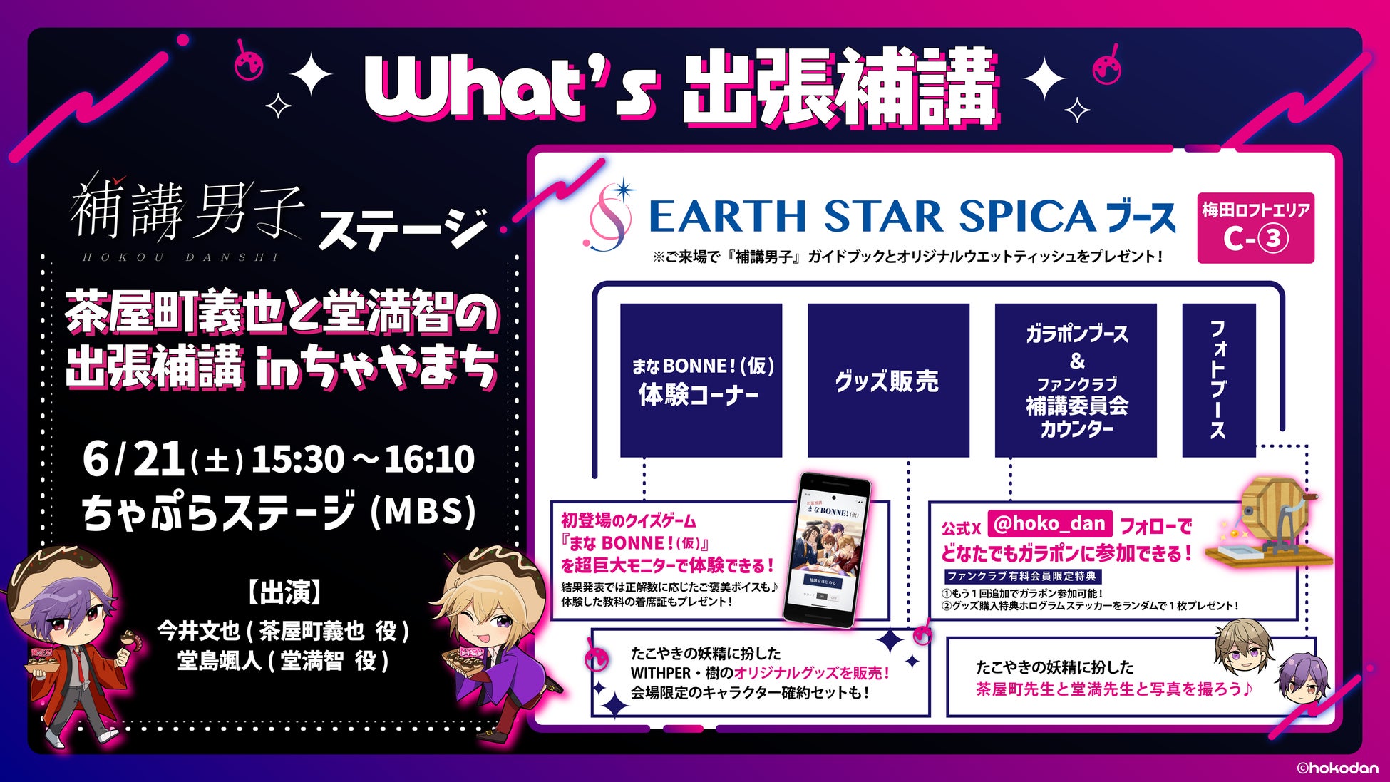 株式会社アース・スター エンターテイメント(本社:東京都品川区)は、2025年6月21日(土)~22日(日)開催の「ちゃやまち推しフェスティバル」に、メディアミックス"着席"プロジェクト「補講男子」としてブース・ステージ出展をいたします。最新情報が多数解禁されるステージに加え、初登場の巨大サイネージクイズ"まなBONNE!(仮)"やおなじみのガラポンなど、ブースもお楽しみ盛りだくさんでお届けします!