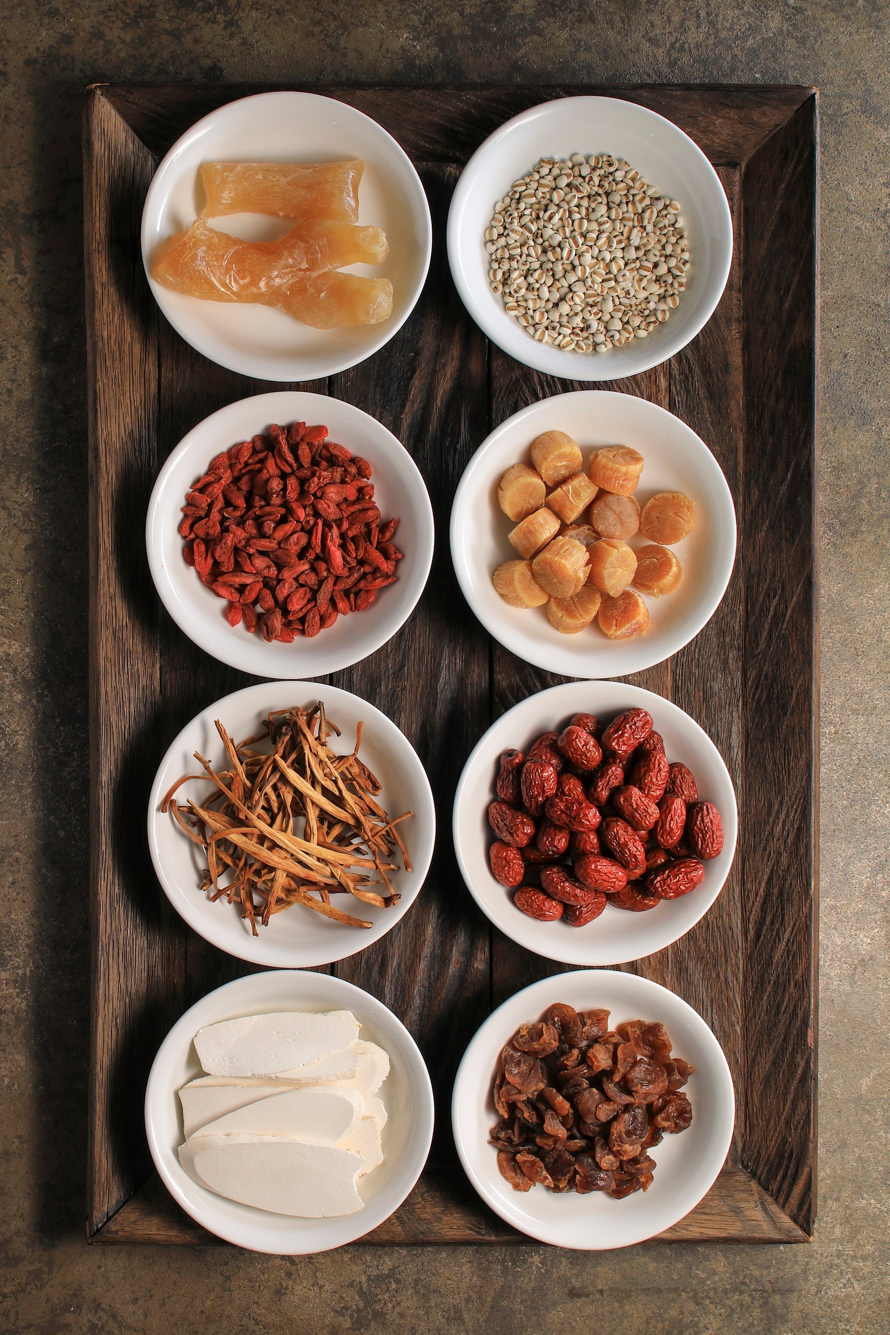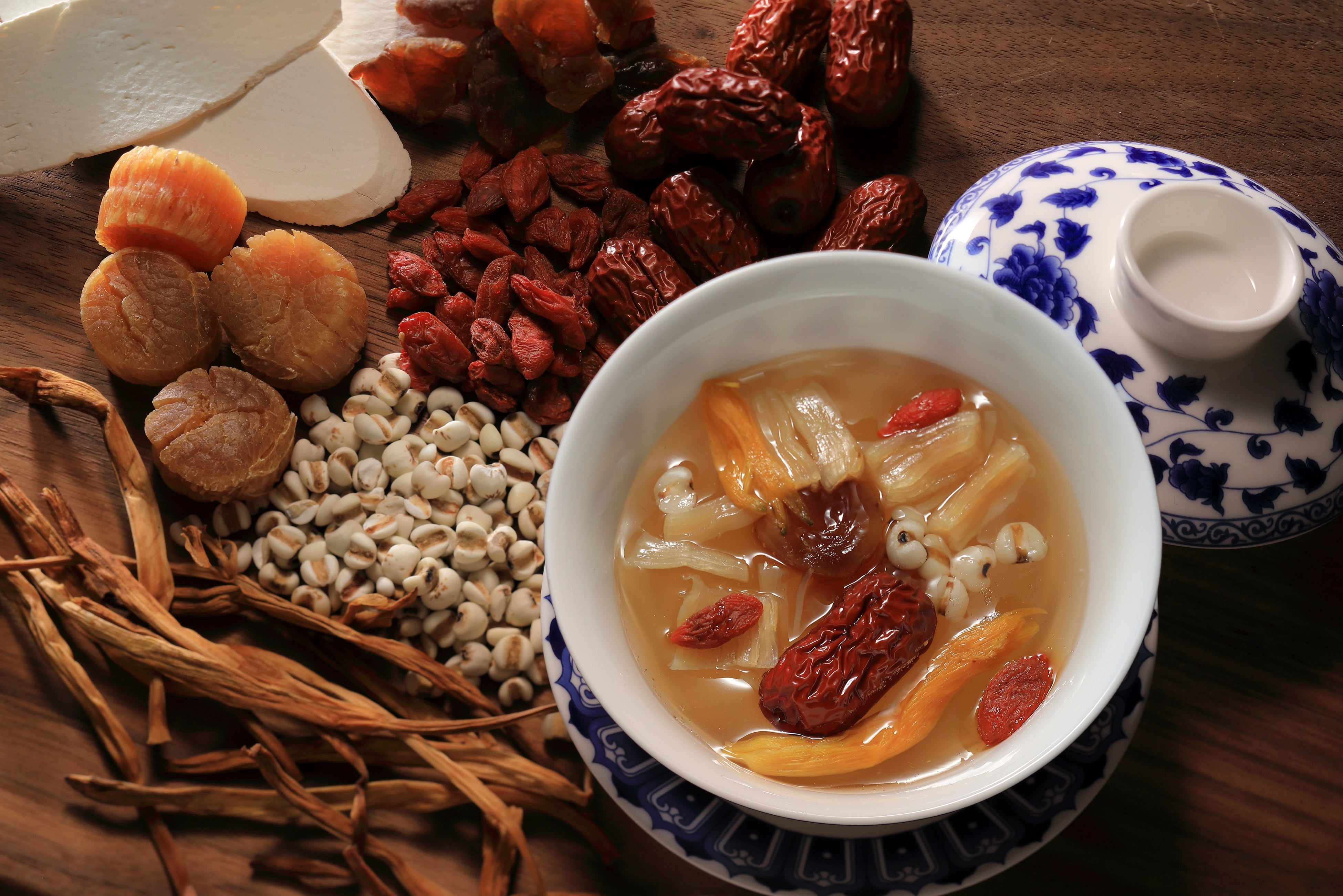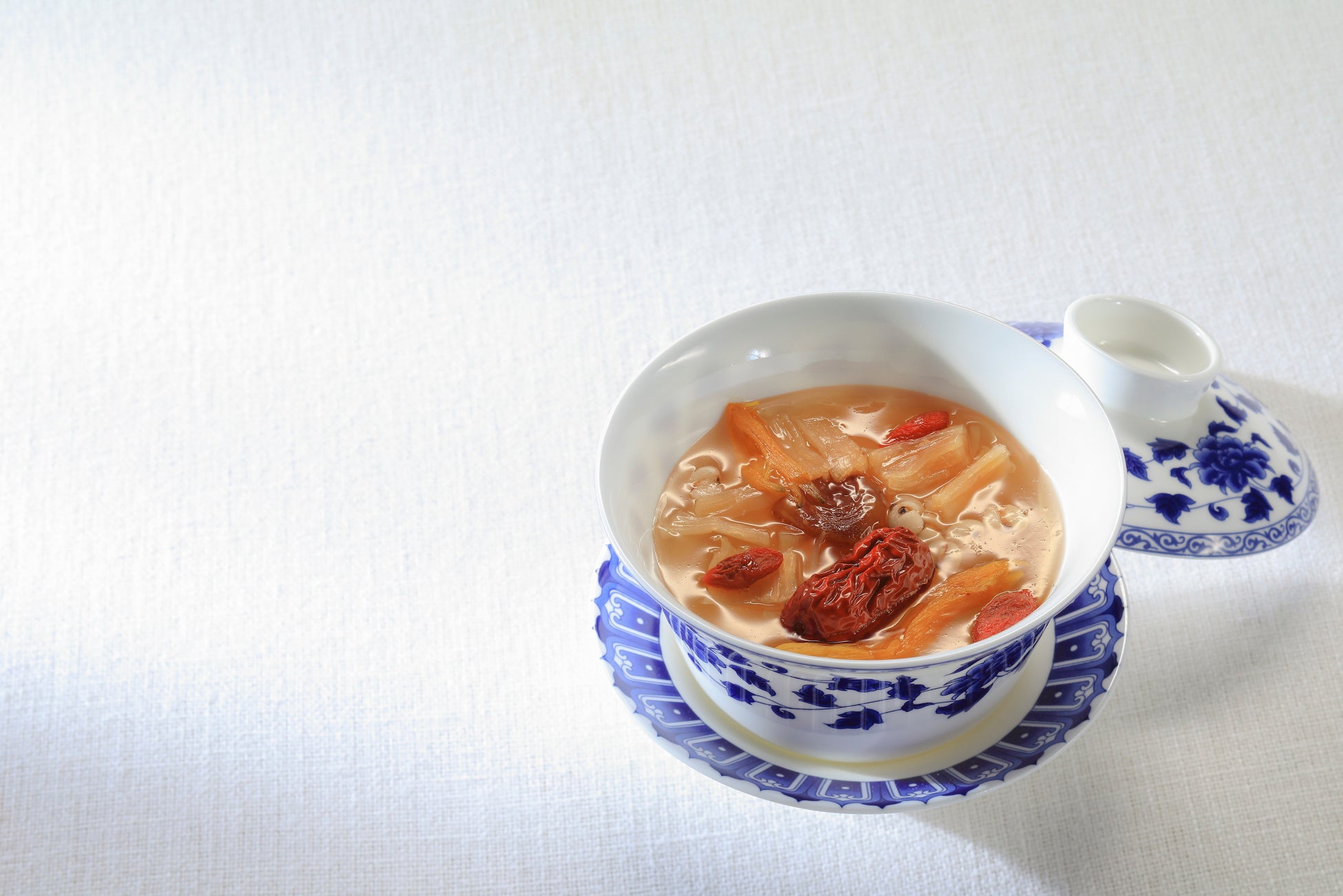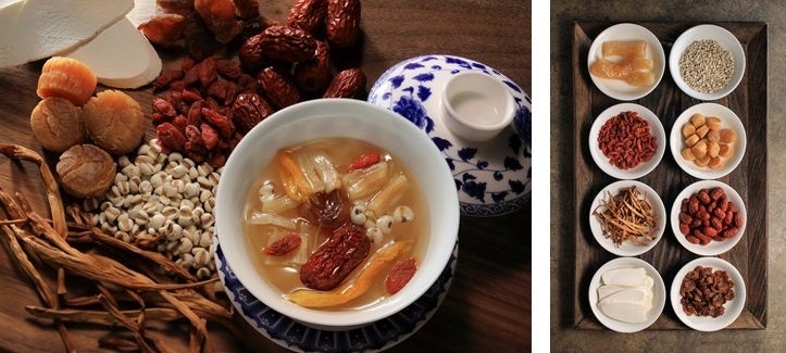 疲労回復に薦められることが多い鶏、豚、乾燥山芋や、コラーゲンを含んだ鶏脚のほか、薬膳スープでありながら美味しさにこだわり、干し貝柱や枸杞、棗、龍眼で塩味や甘味の微妙なバランスを整えました。2日間かけてじっくりとベースのスープを仕込み、さらに5時間各素材の滋味を抽出し、調味料を使用することなく味わい深いスープに仕上げました。