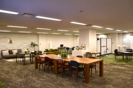(右)企業の垣根を超えた出会いや会話を生み出す「共創テーブル」など、「共創」に特化した設備や仕組みが特徴