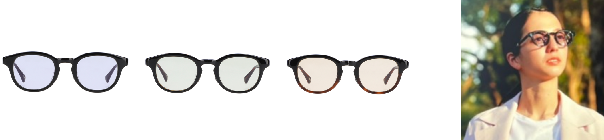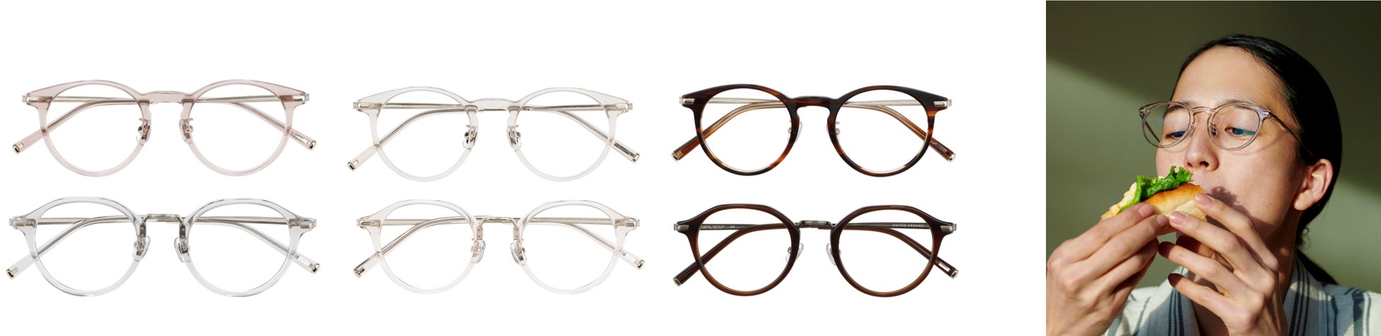 メガネフレームは春らしいやわらかなカラーリングのセルフレームや、人気再燃中の黒ブチやブラウンなど定番カラーもラインアップ。まつ毛がレンズに当たりにくい全型調整可能な鼻パッド仕様です。