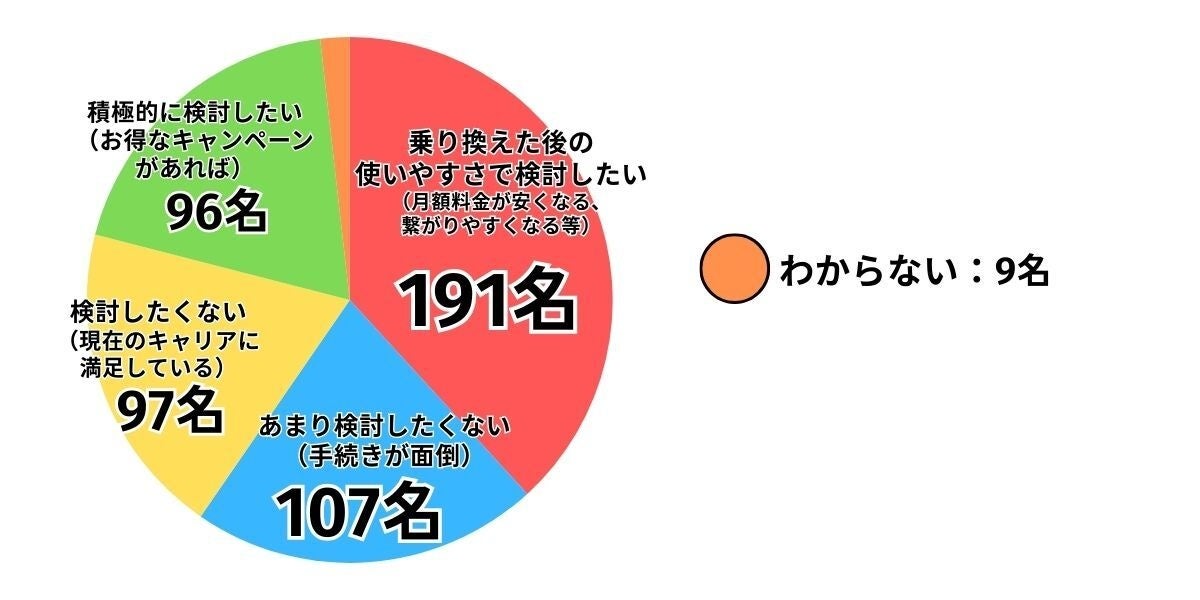 iPhone購入のために乗り換えを検討したいかどうかについては、「乗り換えた後の使いやすさで検討したい」が191名(38.2%)、「積極的に検討したい」が96名(19.2%)と、合わせて6割近くに前向きな姿勢が見られた。