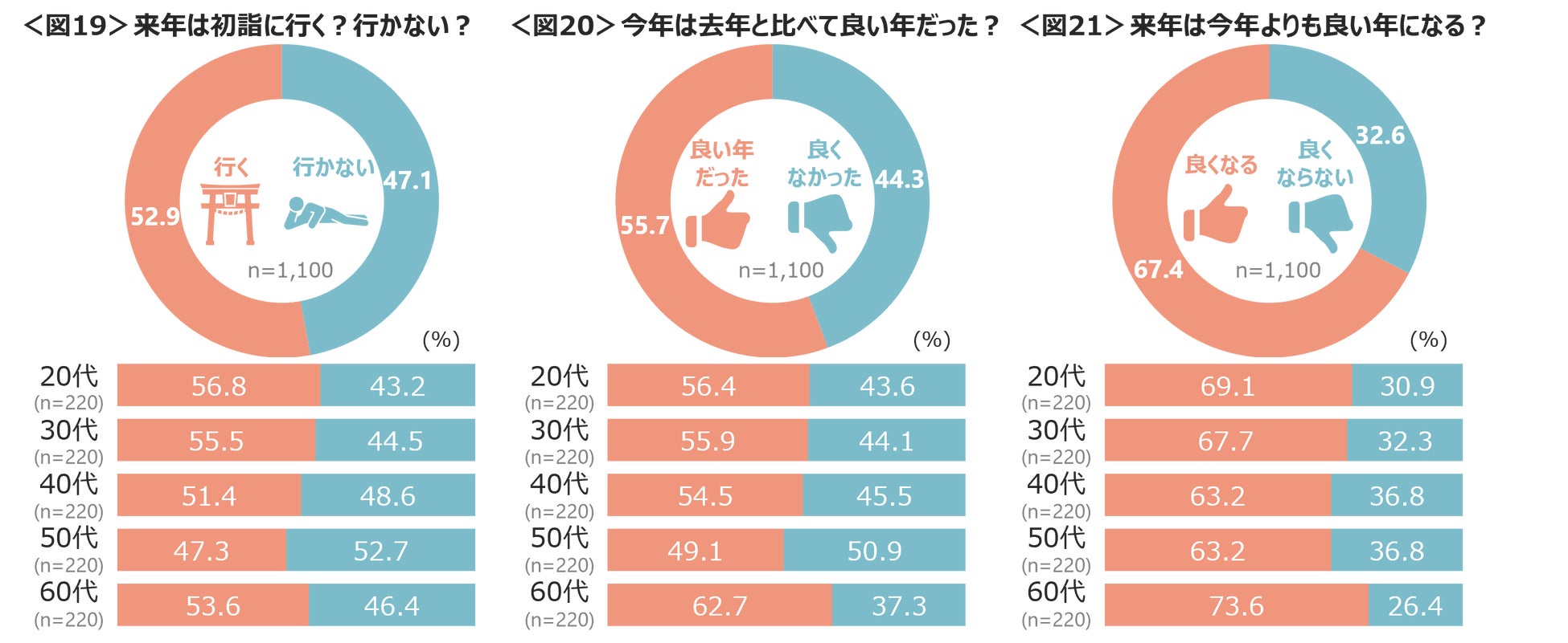 初詣には「行く」が52.9%、「行かない」が47.1%と同程度。