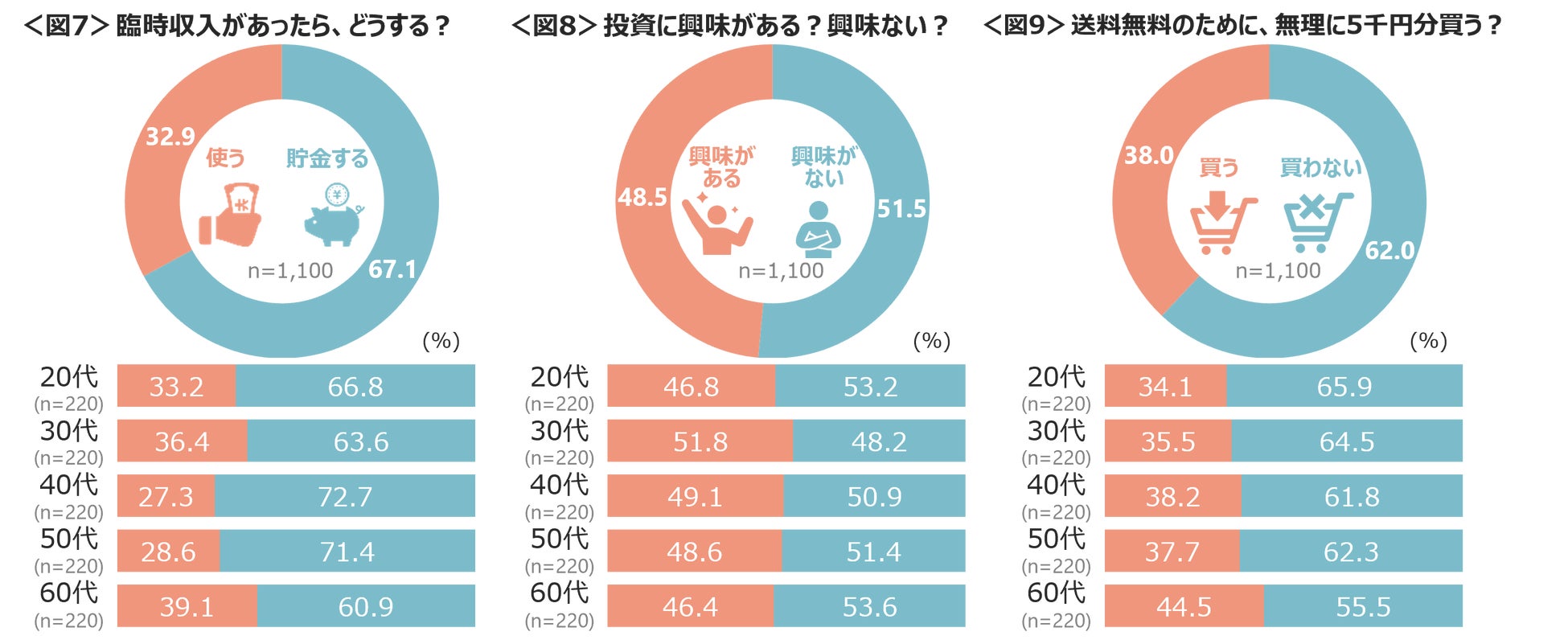 臨時収入があった場合は、「使う」よりも「貯金する」が67.1%と多数派。