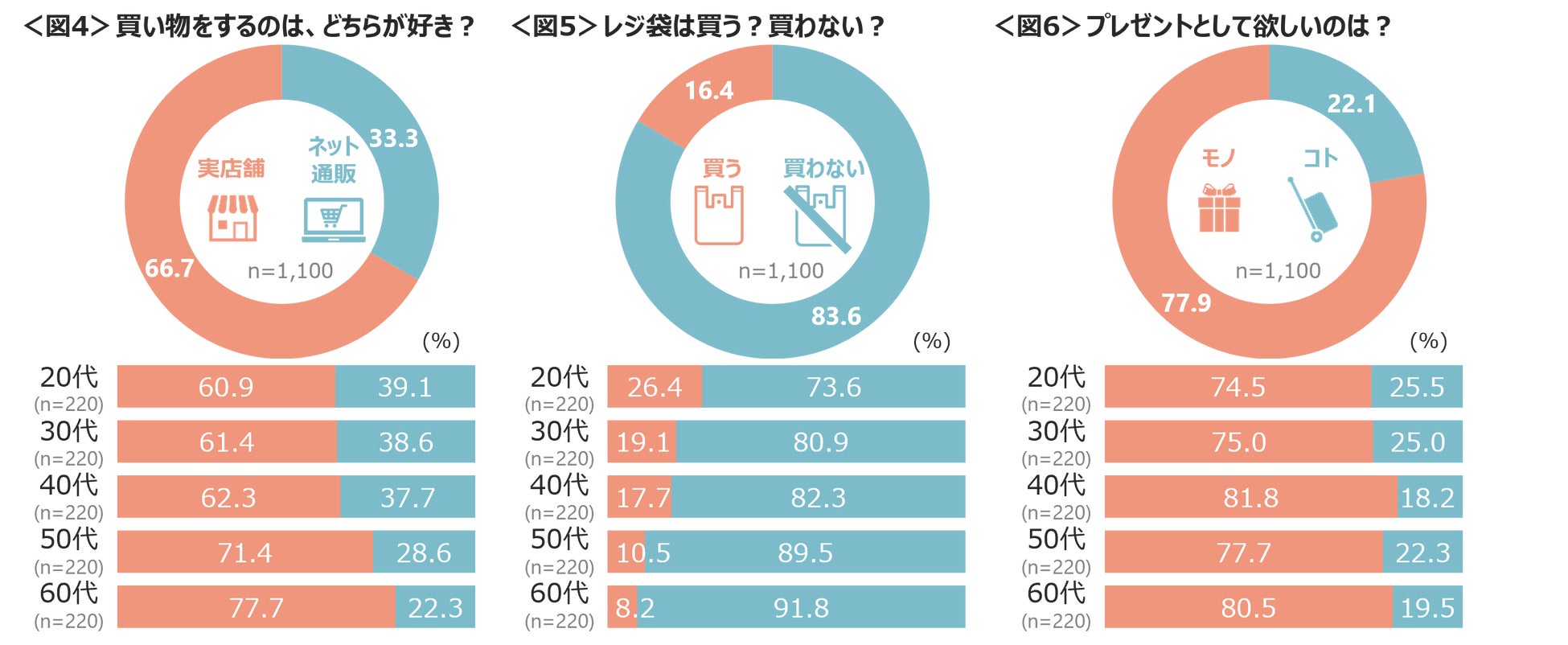 買い物は、「実店舗」の方が好きが66.7%。年代が上がるほど「実店舗」の方が好きな割合が増える。