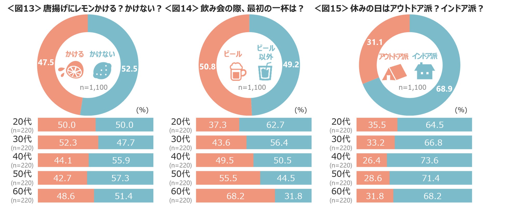 唐揚げにレモンを「かける」は47.5%、「かけない」が52.5%と半々。40代、50代は「かけない」派がやや多い。