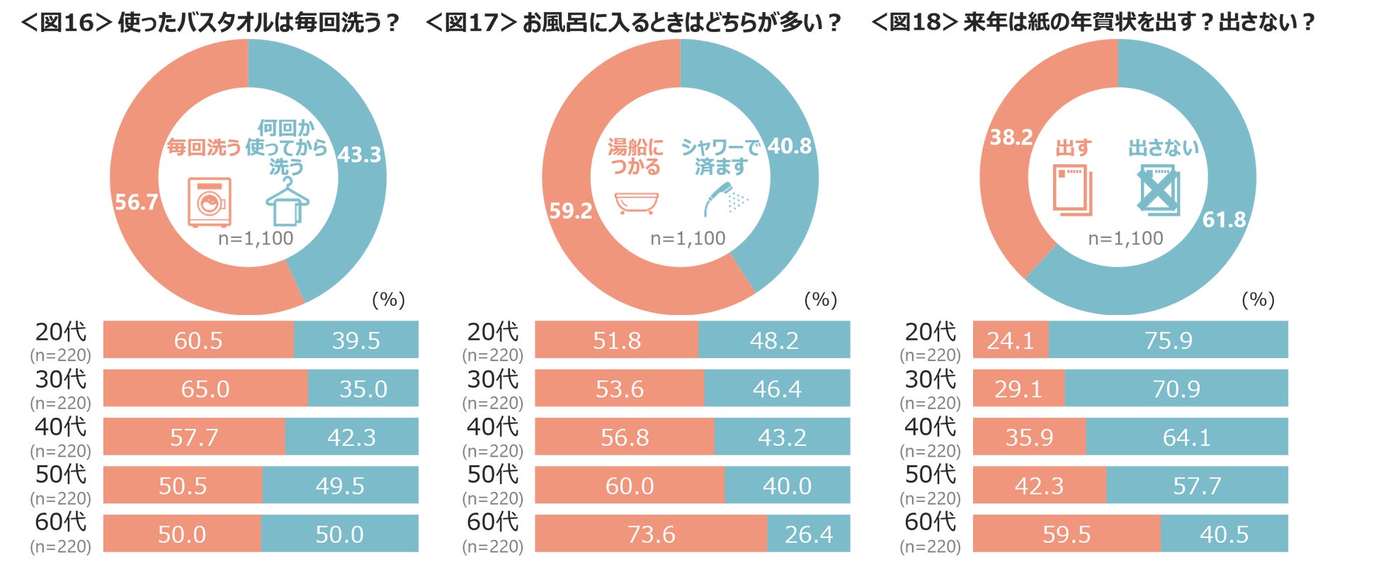 バスタオルは「何回か使ってから洗う」が43.3%、「毎回洗う」の方が56.7%とやや多い。20代、30代は「毎回洗う」が6割超え。