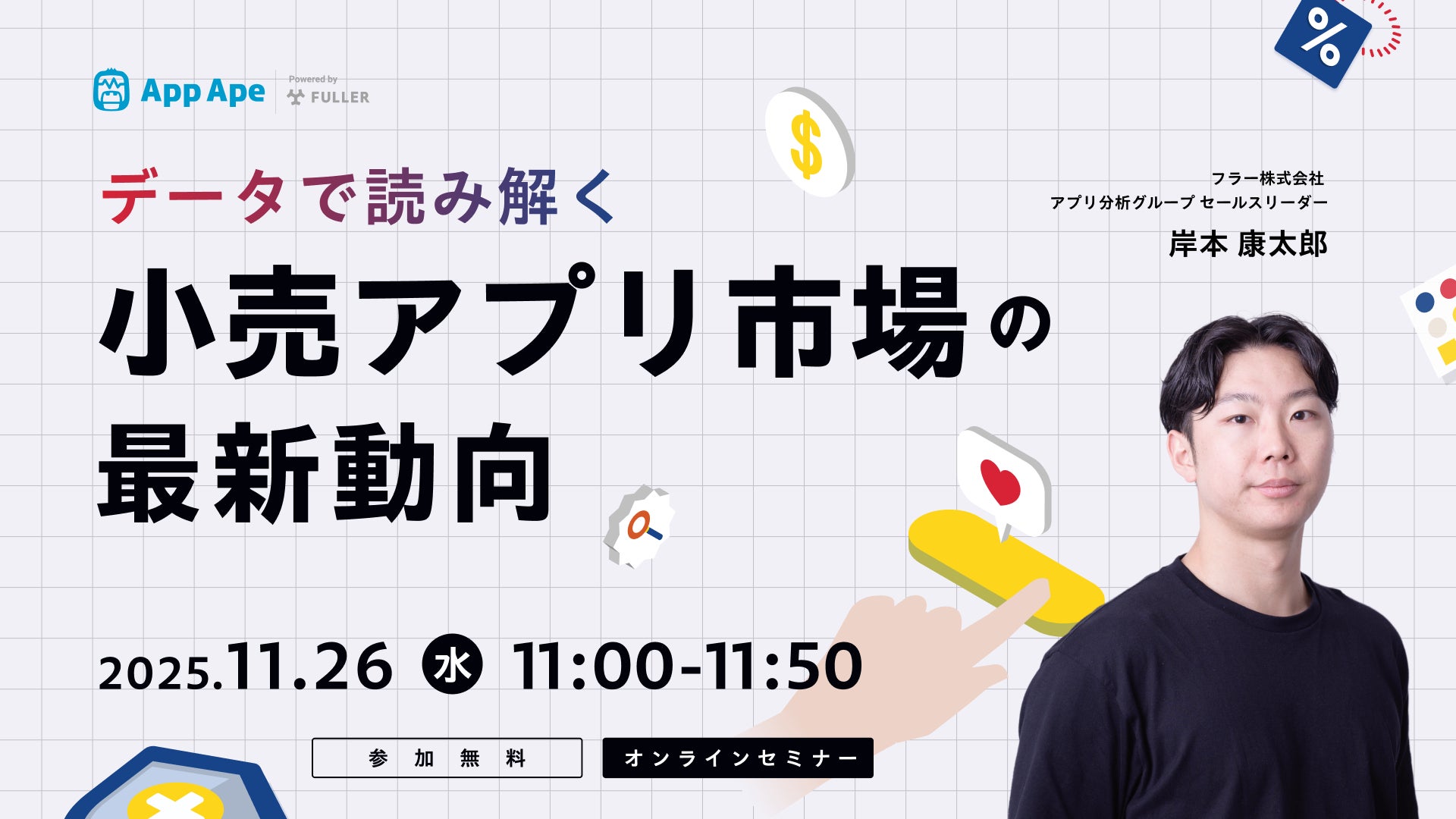 アプリ市場分析サービス「App Ape(アップ・エイプ)」を手がけるフラー株式会社(本社:新潟県新潟市、代表取締役社長:山﨑将司、以下「フラー」)は、小売アプリ市場の最新動向を解説するオンラインセミナー「データで読み解く小売アプリ市場の最新動向」を2025年11月26日(水)に開催いたします。