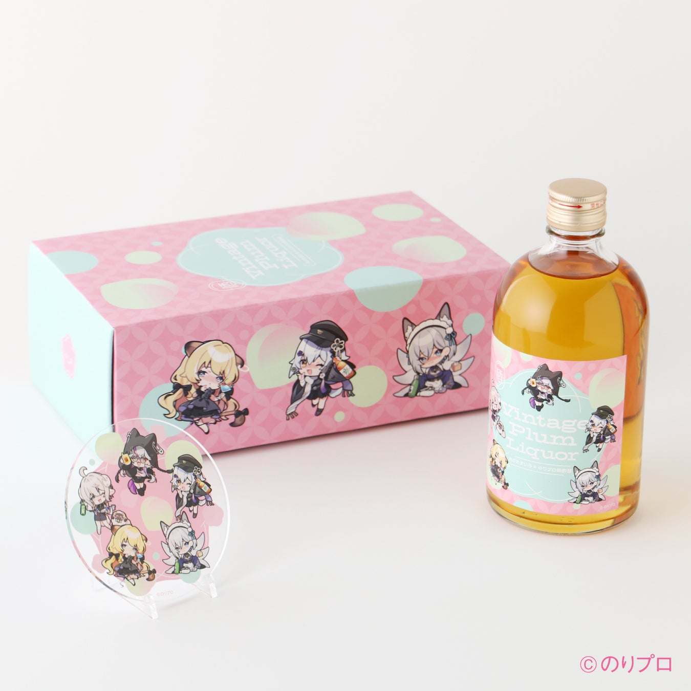 「Vintage Plum Liquor れぐたまいろ×のりプロ晩酌部」をご購入いただいた方には、購入特典として、ラベルと同じ描き下ろしイラストがデザインされた、アクリルコースター1個をお届けします。さらに抽選で、タレントごとのサイン入りラベルが当たります(タレント1名につき各1名様)。ご購入時に抽選に応募するタレント1名をご選択ください。