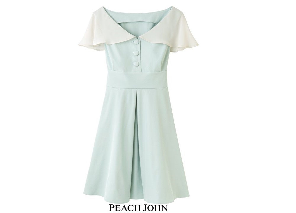 シフォンの襟と、フィット&フレアシルエットのフェミニンなワンピース。大きなシフォンの襟がそのまま袖のように肩を覆い、ふんわり波打って二の腕をほっそり見せ。フロントはレトロな大ぶりボタンで開閉、バスト下にタック入りで胸元をきれいに包みます。