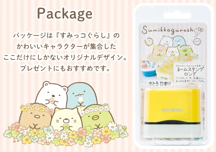 お名前のすみっこにいるキャラクターはどれも愛らしいものばかり。ポン!と自分のもちものに押すだけで、いつでもどこでも大好きなすみっコと一緒にいられる「すみっコぐらし もちものスタンプロング」。はんこというと事務的でお堅いイメージがありますが、 わたしたちはこれからも好きな人にはたまらないユニークな企画をつうじて、 ハンコに愛着を持つ人を増やしてまいります。