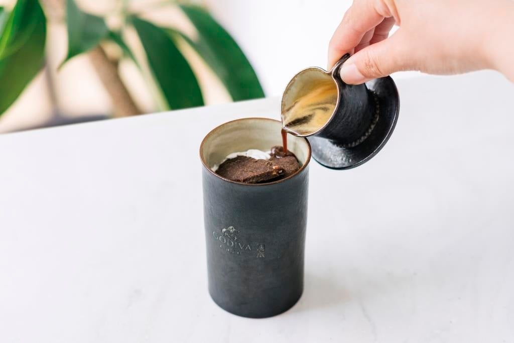 福井県産の蕎麦粉のクッキーと、シャンティ(ホイップクリーム)を添えた、チョコレートのコクが濃厚で口あたりなめらかなゴディバのソフトクリーム ダブルチョコレートに、チョコレートに合う味わいを追求したGODIVA café オリジナルブレンドエスプレッソをかけてお召し上がりいただきます。