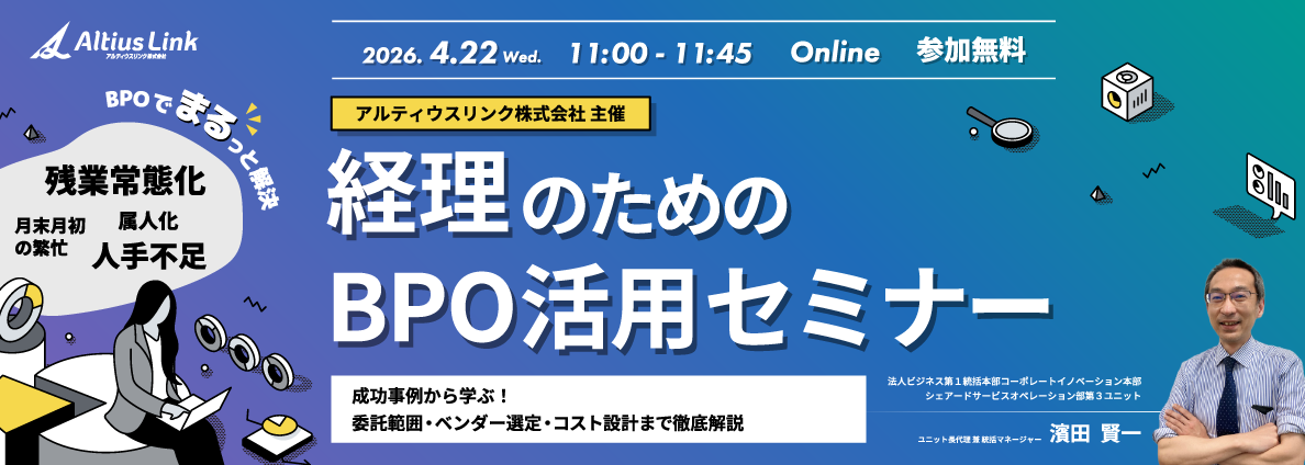 アルティウスリンク株式会社(所在地:東京都渋谷区、代表取締役社長:那谷 雅敏、以下 アルティウスリンク)は、2026年4月22日(水)にオンラインセミナー「経理のためのBPO活用セミナー~成功事例から学ぶ委託範囲・ベンダー選定・コスト設計まで徹底解説~」を開催します。