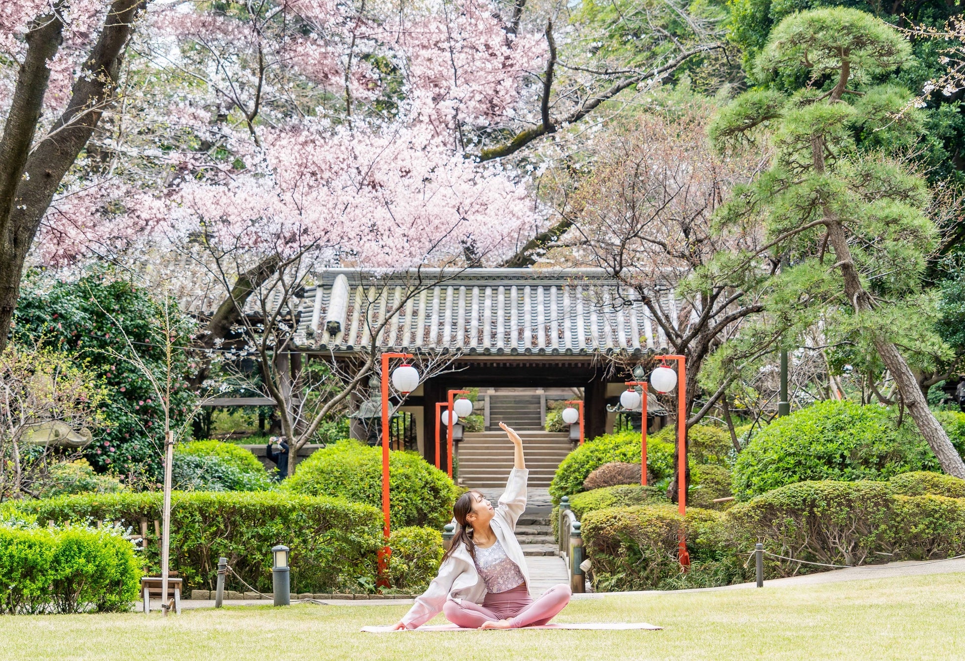 桜に包まれ自然と一体になりながら、呼吸を感じ、身体を動かすエクササイズ。