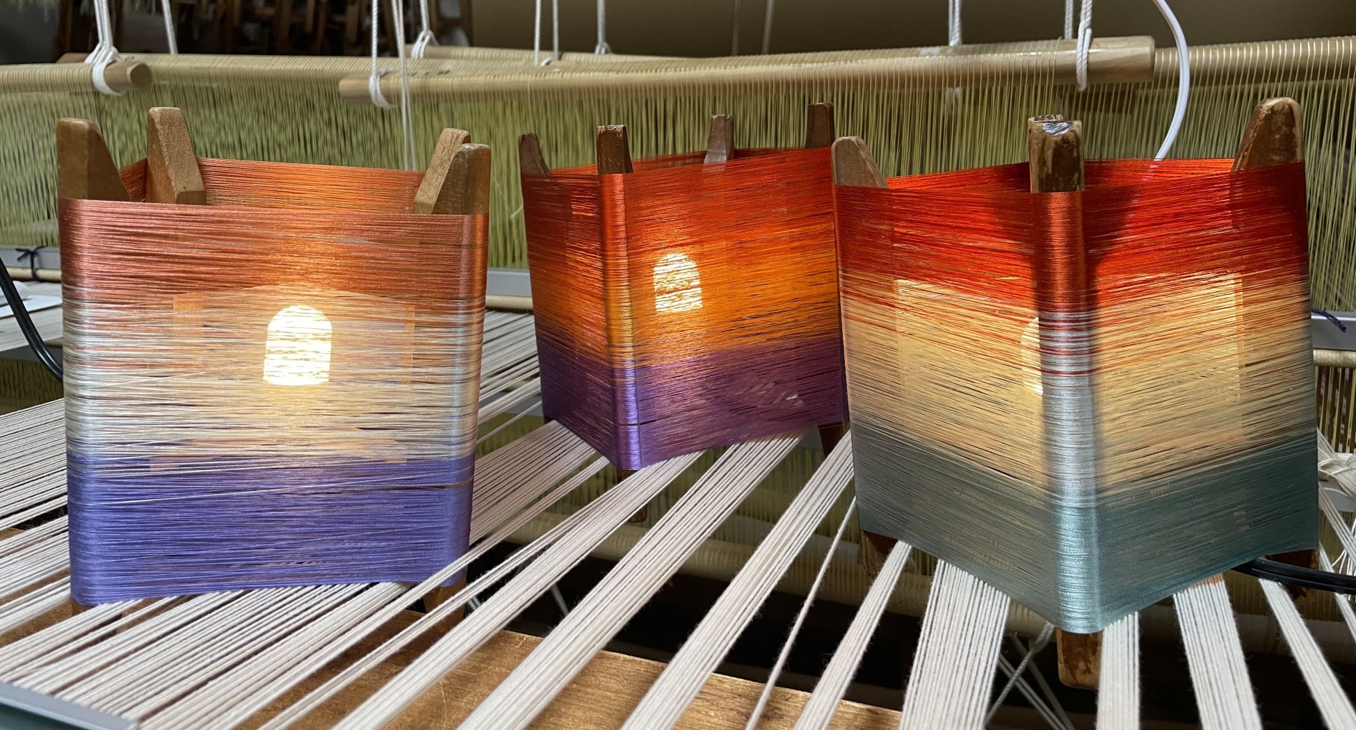 西陣織ならではの様々な色の鮮やかな絹糸からお好きな色を3色使用し、木枠に巻き付け、