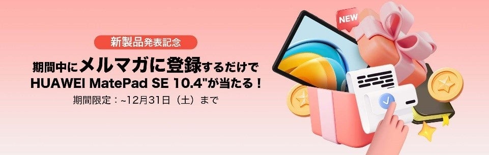 期間中にHUAWEI 公式サイトにてメルマガを新規ご登録いただいた方の中から抽選で1名様に、新製品の『HUAWEI MatePad SE 10.4"』をプレゼントいたします。この機会にメルマガを購読して、ファーウェイ製品の最新の情報をチェック!