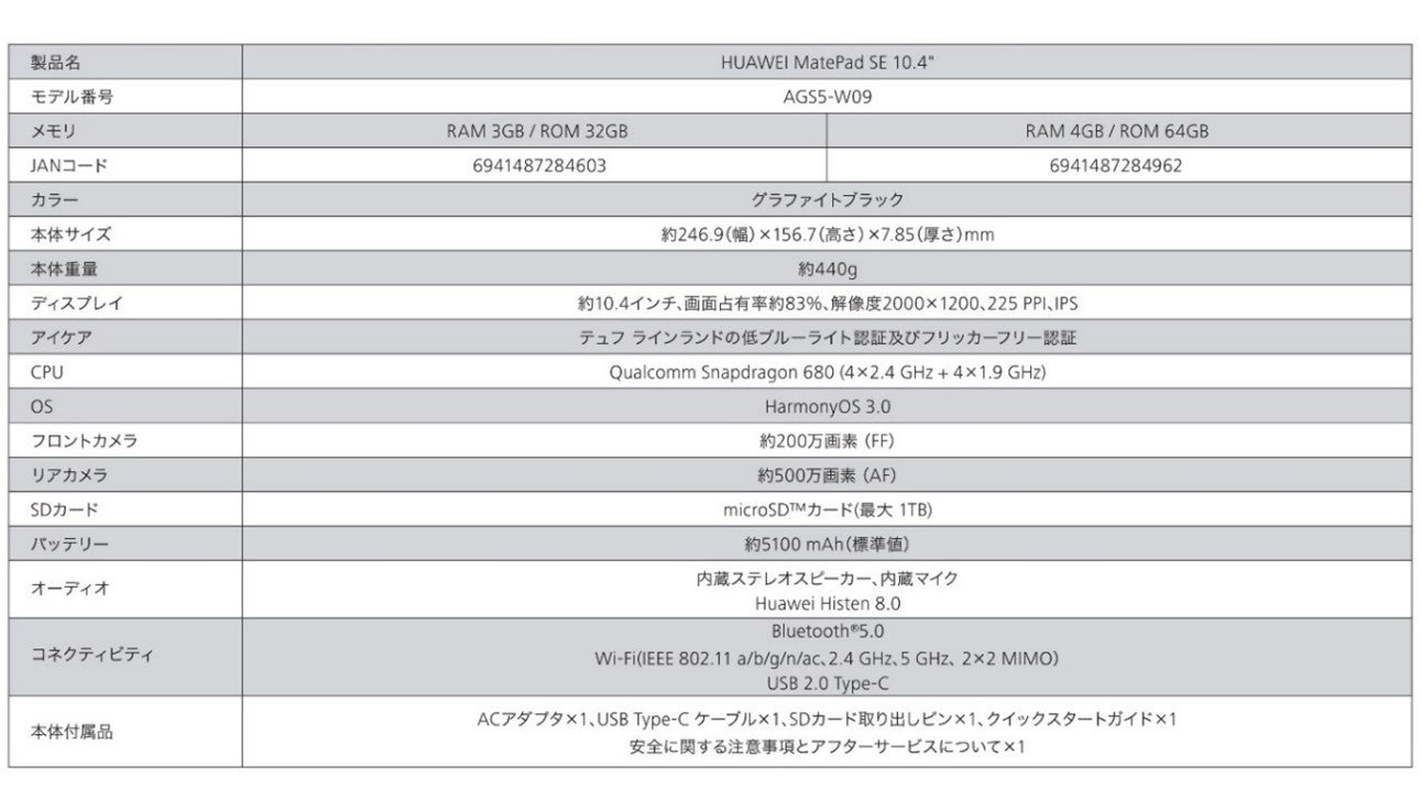 『HUAWEI MatePad SE 10.4"』の主な仕様