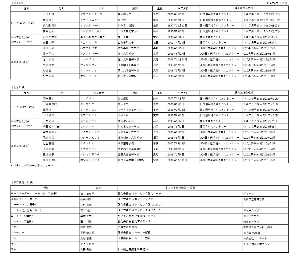 2024年3月30日(土)にベオグラード(セルビア)で開催される「ベオグラード2024世界クロスカントリー選手権大会(https://www.jaaf.or.jp/competition/detail/1837/)」に派遣する日本代表選手が下記の通り決定しましたのでお知らせいたします。