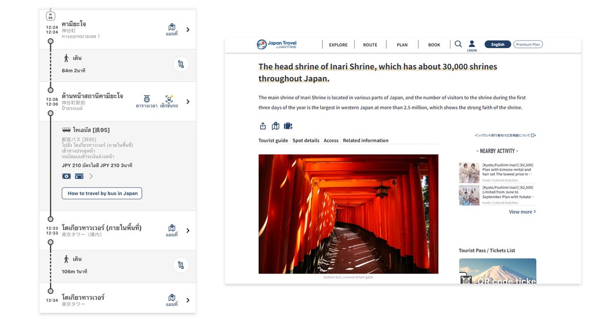 観光ガイド、観光スポット等の施設情報、および公共交通の表示に関する多言語コンテンツを拡充しました。当社の国内サービスで提供しているコンテンツをもとに、観光ガイド380万件、施設情報40万件を5言語(英語、韓国語、簡体字、繁体字、タイ語)に翻訳しました。また、ルート検索機能に表示される公共交通情報のうち、一部情報(列車名、出入口情報、バス路線名など)が英語のみの対応となっていましたが、観光ガイドと同様の5言語に対応しました。多言語コンテンツの拡充と多言語対応範囲を広げることにより、Webサービス全体のアクセス数は前年比約30%増となりました。