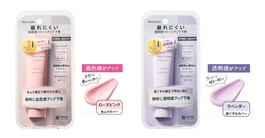 毛穴・色ムラ補正で血色感をプラスする「モイストラボ トーンアップ下地<ローズピンク>」、くすみを飛ばして透明感のあるキレイが続く「モイストラボ トーンアップ下地<ラベンダー>」の2種
