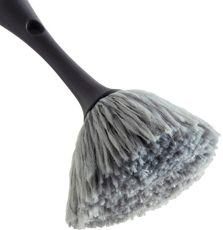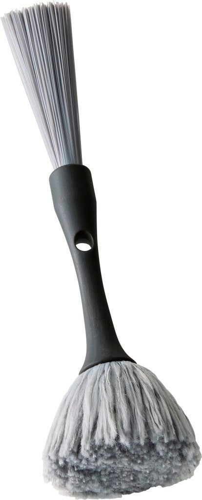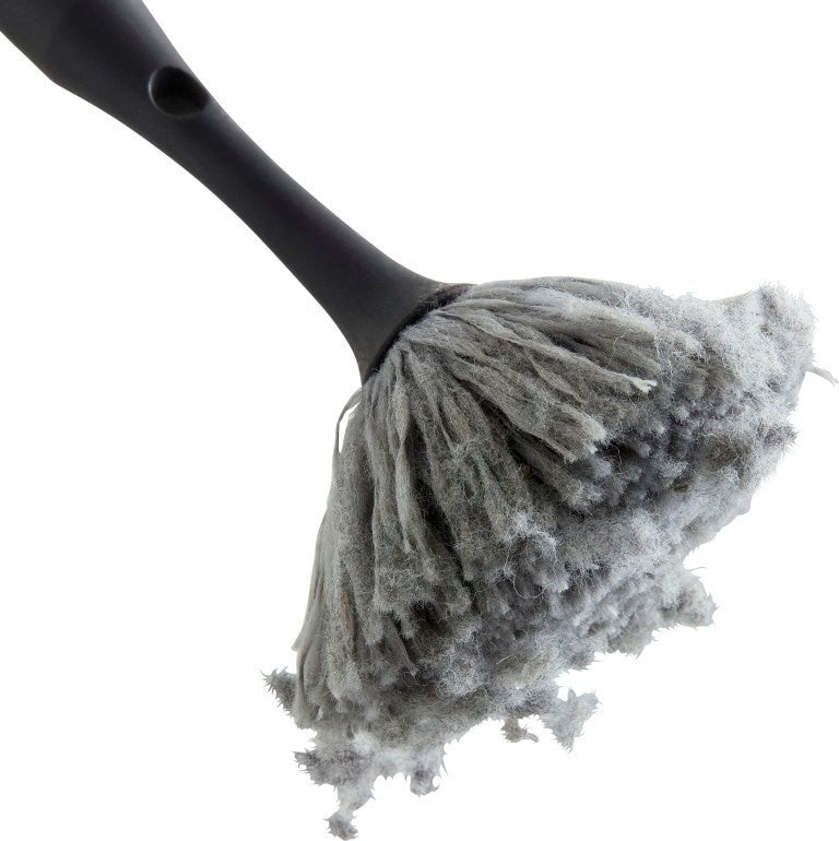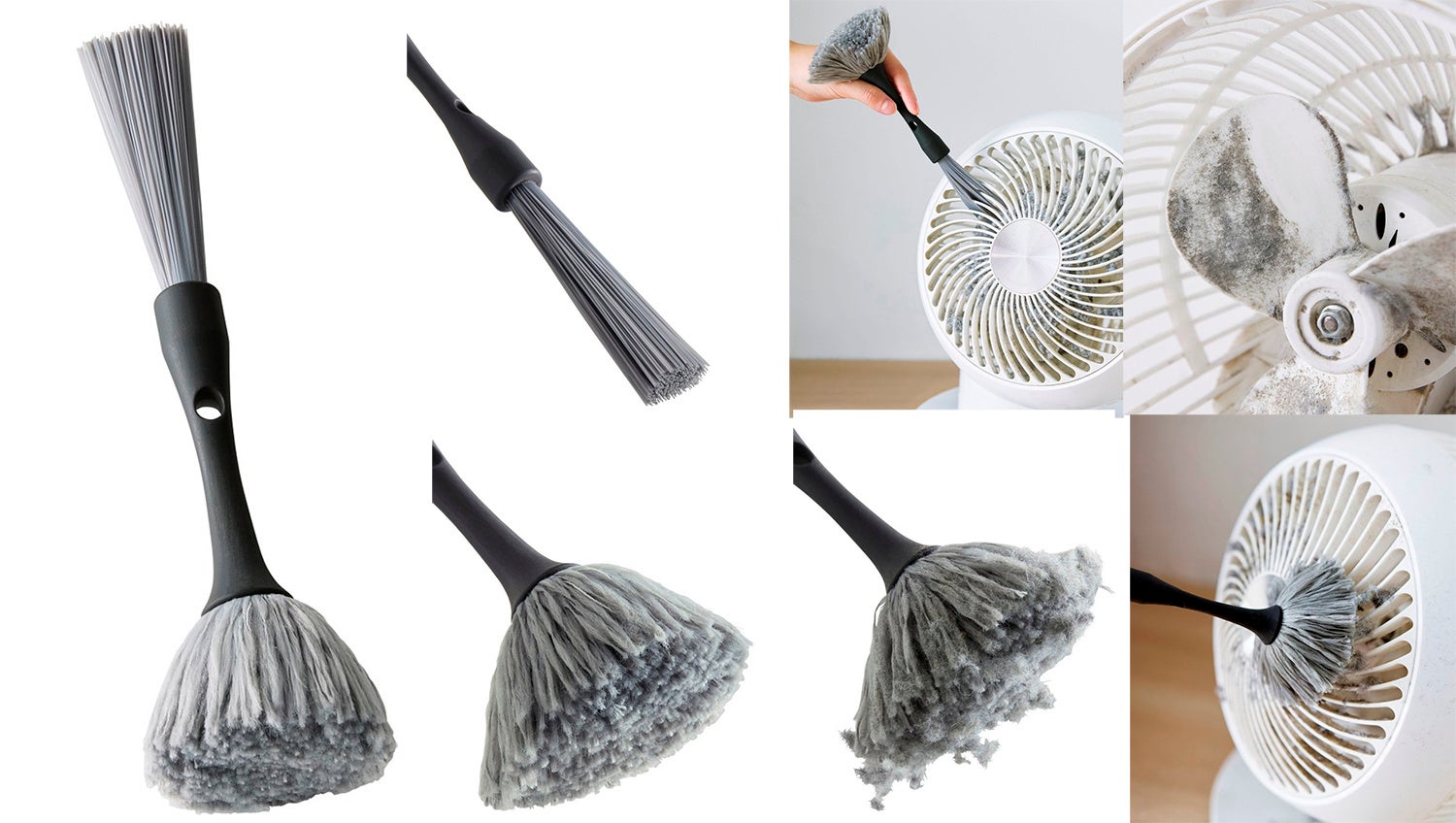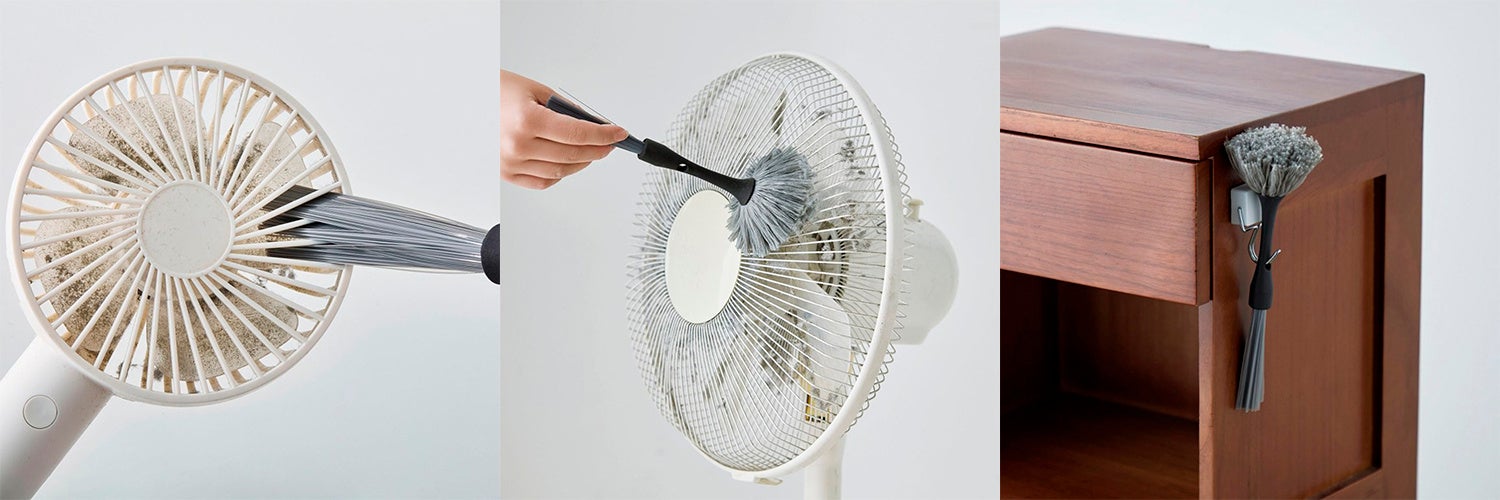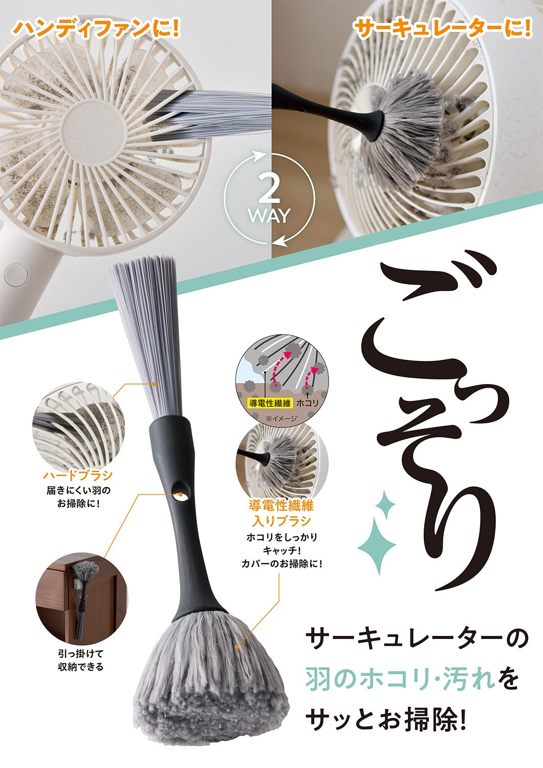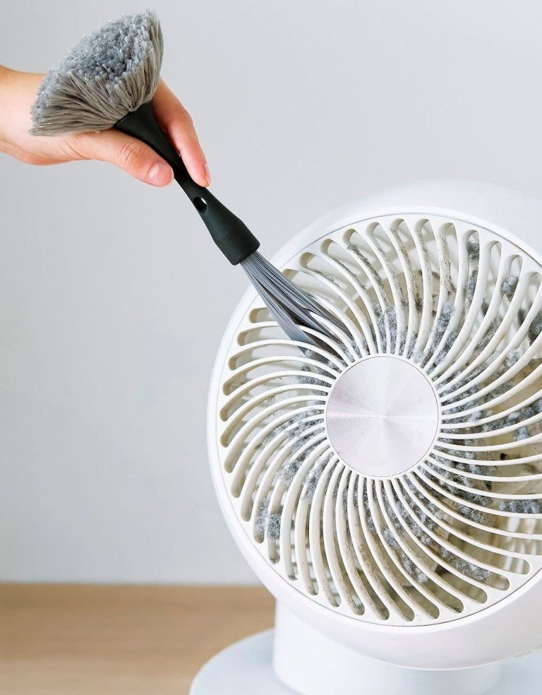 もう一方の導電性繊維入りブラシは、ホコリが舞い上がりにくく、サーキュレーターやハンディファン、扇風機のカバー部分をやさしくお掃除ができる。静電気を抑えながらホコリをキャッチするので、周囲を汚しにくく、仕上げ掃除にもぴったりです。