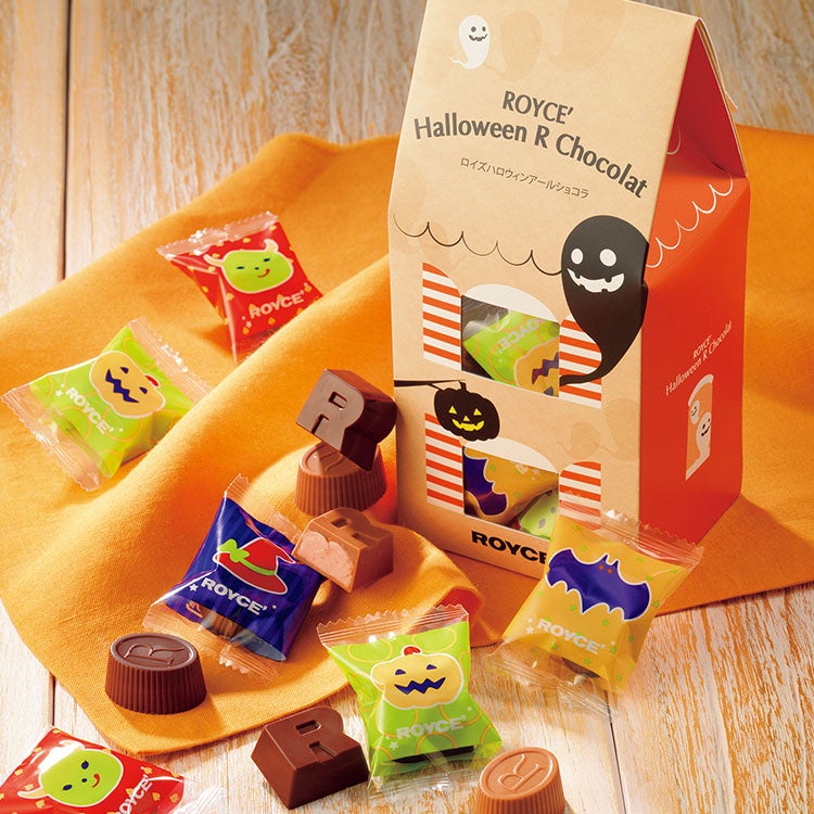 ナッツやフルーツなどのクリームをショコラに閉じ込めた人気商品「ロイズアールショコラ[4種詰合せ]」を、ゴーストハウスをイメージしたハロウィン限定パッケージに詰めました。個包装にもハロウィンの柄を散りばめています。お友だちへハロウィンのおすそ分けをしませんか?