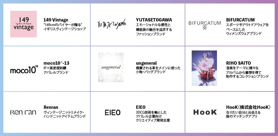 2026年2月からは、5期生として書類・面接審査を経て3者が新たに入居しました。”Athletic form”をコンセプトに、スポーツやアウトドアウェアをベースにしたウィメンズウェアブランド「BIFURCATUM(ビフルカツム)」、音楽をテーマに様々なアルバムから着想を得てコレクションを制作するファッションブランド「RIHO SAITO(リホ サイトウ)」、3DCG技術を軸にアパレル企業のクリエイティブ開発を包括的に支援する「EIEO(エイイーオー)」が入居。3者ともアパレル企業での勤務経験があるクリエイター。事業を前進させるための経営基盤を築けるよう、サポートを行ってまいります。
