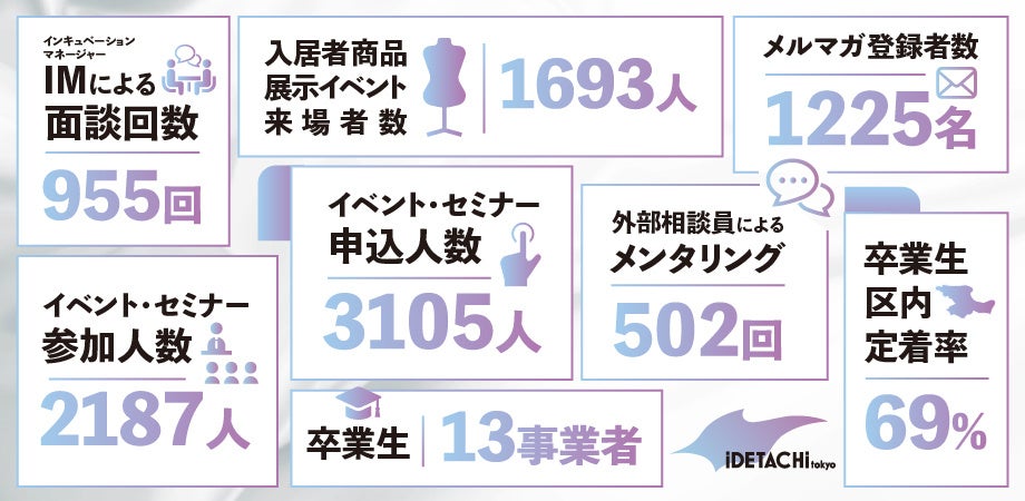 イデタチ東京は、ファッション関連産業で起業したい方をサポートする荒川区立の起業支援拠点です。継続的に成長可能なファッションビジネスを行えるよう、起業・経営をサポートするインキュベーションマネージャー(以下IM)が入居者と月2回必ず面談を行うほか、先輩起業家、デザイナー、弁護士、税理士、コピーライター等、多様な専門分野をもつ9名のメンターが入居者をバックアップ。5年間で計955回のIM面談、計502回のメンタリングを実施しました。IM面談やメンタリングを通し、事業課題、コンセプト整理、トラブルやリスク回避などについてアドバイスを行い、入居者の事業を伴走サポート。入居者アンケートからは、「事業を進める上で色々な角度からバックアップ、伴走してくれる」「IM面談では、手探りで事業を進める中で指針の壁打ちをしてもらえありがたい。メンタリングで自分たちに欠けている知見を補え助かっている」等の声が寄せられました。創業初期は事業に関する悩みやトラブルも多い中、相談できる人が少ないのが課題でもあり、インキュベーションマネージャーやメンターをはじめ、気軽に相談できる弊施設の環境が事業進捗に寄与していると言えます。